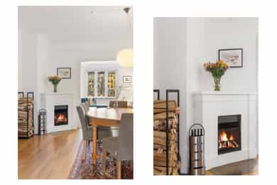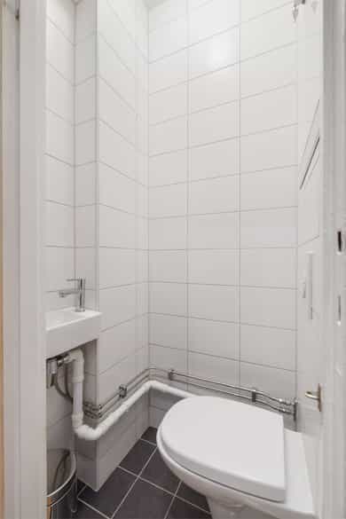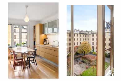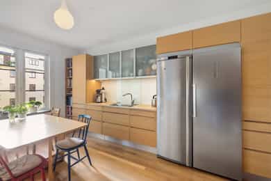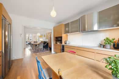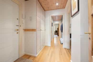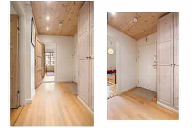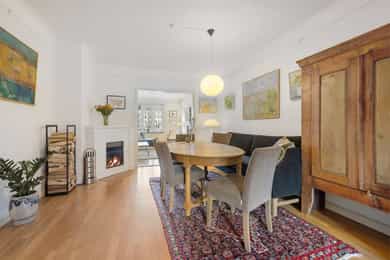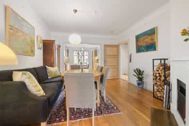 Entré: Velkommen inn! I leiligheten møtes du av en praktisk og flott entré som gir et godt førsteinntrykk. I entréen er det garderobeskap for oppbevaring av sko og yttertøy. Gangen har en sentral plassering i leiligheten, som sikrer god flyt mellom alle rommene. Porttelefon og sikringsskap. Kjøkken: Leiligheten har et herlig, sosialt spisekjøkken med god plass til stor spisegruppe. Stilig HTH-kjøkken fra 2015 med glatte fronter i eik, enkelte overskapsfronter med glass og benkeplate i bambus. Det er glassplate på vegg over oppvaskkum og platetopp. Lys og stikkontakt under overskap og underlimt oppvaskkum i stål med ettgrepsarmatur. Det er integrert stekeovn, platetopp, oppvaskmaskin, vinskap og mikroovn og frittstående kjøleskap. Kullfiltervifte over stekesonen. Det er montert komfyrvakt og automatisk vannstopper etter dagens krav. Det er godt med lagringsplass i både skap, skuffer, hyller og høyskap samt god arbeidsflate for matlaging. Stue: Lys og innbydende stue av god størrelse. I stuen er det god plass til sofagruppe med tilhørende sofabord og tv-møblement. Overflatene består av tre-stavs eikeparkett og veggene er malt i lyse farger. Den gode takhøyden på 2,65 meter og det gode lysinnslippet gir en god romfølelse. Videre har stuen en velutformet planløsning som gjør innredningsjobben enkel. Hyggelig mellomstue som kan innredes etter ønske og behov. Rommet passer svært godt som separat spisestue, bibliotek eller peisestue. Rommet er i dag innredet med stort spisebord - perfekt for gjester. Flott peisovn sikrer behagelig og vedvarende varme, samtidig som den bidrar til hyggelig stemning på kalde høst- og vinterkvelder. Den gjennomgående planløsningen sikrer optimale lysforhold i leiligheten. To soverom: Leiligheten har to soverom. Hovedsoverommet er romslig, og har god plass til dobbeltseng, nattbord og garderobeskap. Fra hovedsoverommet er det adkomst til den innvendige boden som sikrer godt med ekstra lagringsplass. I dag er det innredet med hylleløsning i boden. Soverom 2 passer godt som barnerom, gjesterom eller hjemmekontor. Rommet har plass til seng, skrivepult og skap. Begge rommene har store vindusflater som sikrer godt med lys og luft. Det ene soverommet vender mot bakgård. Bad: Bad med flislagte overflater og opplegg for vaskemaskin. Badet består av dusjkabinett og vegghengt servant med ettgrepsarmatur fra Oras. Innfelt speil i vegg. Badet er fra ca. 1999 iht. opplysninger fra eier. Toalettrom: Praktisk, separat toalettrom med adkomst fra gangen. Rommet har flislagte overflater, og er utstyrt med veggmontert toalett og vegghengt servant med ettgrepsarmatur fra Damixa. Overflater: Gulv: Tre-stavs eikeparkett og flislagt gulv på badet. Vegger: Malt overflate på veggene og fliser på badet. Himling: Malt overflate i himling. På kjøkkenet er takhøyden oppmålt til 2,65 meter.