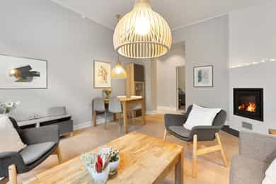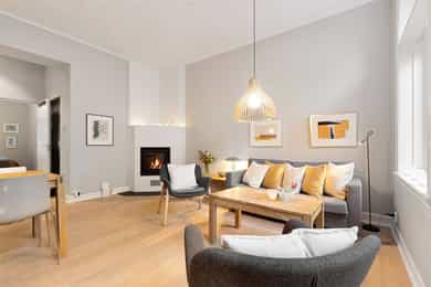 Lys, klassisk og gjennomgående 2-roms selveier m/peis og buede vinduer. 3m takhøyde. Supersentralt i gate u/biltrafikk