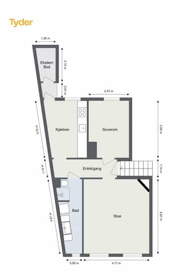 Kjellerbod er ikke måleverdig i sin helhet på grunn av lav takhøyde iht. retningslinjer for arealmåling NS 3940. Gulvareal (GUA) er oppmålt til ca. 24 m².