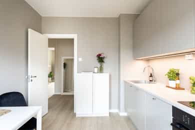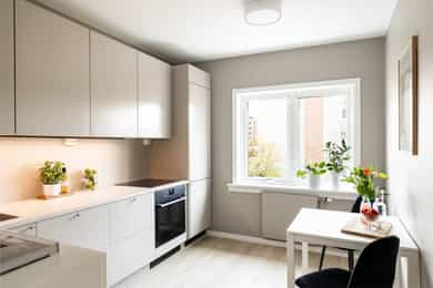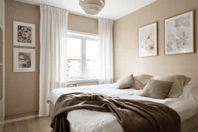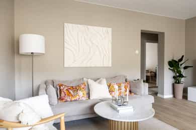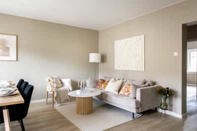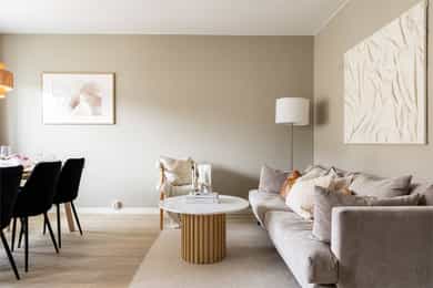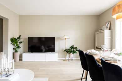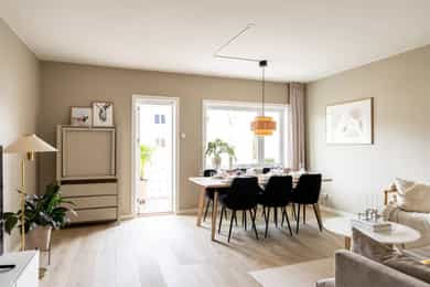 Lys og gjennomgående 2(3)-roms m/solrik balkong. Delikat kjøkken (2025). "Alt" inkl. i FK. Tilbaketrukket beliggenhet.