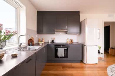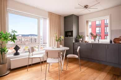 Moderne & luftig 3-R hjørneleilighet m/ 11 kvm balkong i bygg fra 2020. Selveier, 8. etg m/heis & akonto oppvarming