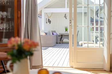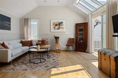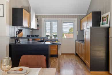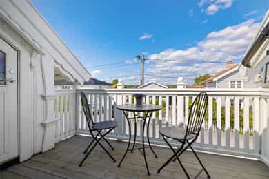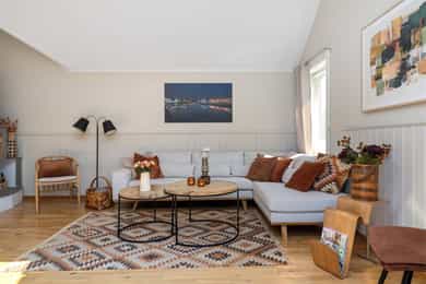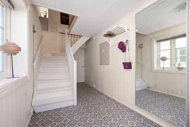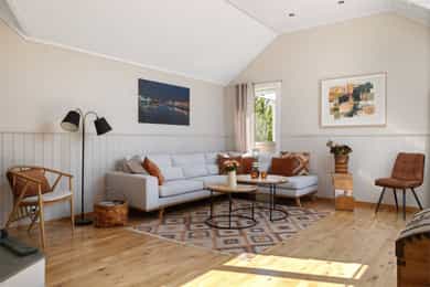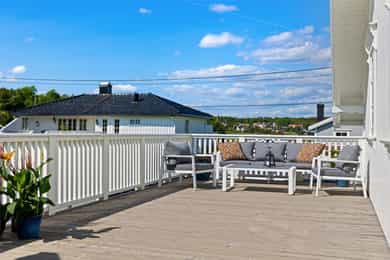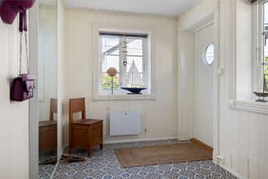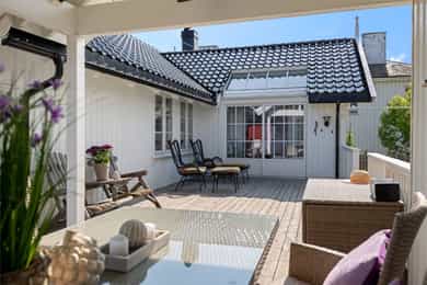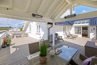 Velkommen til en guidet tur av Skoleveien 15 i Nevlunghavn. Jeg har gledet meg til å vise deg et hus og en planløsning jeg selv alltid har drømt om. For i dette huset så har du sagt at du har for lite bodplass, for siste gang i ditt liv. Her bygde man huset utifra en sportslig livsstil og tilpasset hele plantegningen til en hverdag som skulle romme mye. Og for et resultat det ble. U gonna love it! La oss ta turen inn i boligen. Inngangsdøren ligger på venstre side for huset når du står i oppkjørselen. Det første som møter deg når du går inn i boligen er en romslig entre hvor det ikke skjer så mye, for ganger, entreer og haller er sjeldent så spennende. De skal være praktiske.. Her har du plass til å henge fra deg det du har av klær og sko, og ta turen videre i huset. Blir vi i denne etasjen litt til før vi tar turen opp så tar du døren inn til husets mest lekende rom. Her åpner du opp til det som er husets dobbeltgarasje, men plass til så mye mer. Dette kan være et hobbyrom enten du liker å mekke på biler, sykkel og annet, eller om du har en kunstnersjel og vil gjøre det om til studio for musikk eller kunst. Det er her du tørker våtdrakter, vokser brettet og kjører service på dykkerutstyret. For vær ærlig med deg selv. Du har aldri hatt nok garasjeplass for når begge bilene er inne så har du fortsatt El-sykler, snøfreser, påhengsmotor, gressklipper, vedkløver, 4 surfbrett. 8 par ski, 11 kofferter og et plastikkjuletre du aldri får plassert. Men velkommen til Skoleveien 15. Her får du plassen du fortjener. På innsiden av garasjen har du et stort teknisk rom som viderefører all den plassen du allerede har til alt annet. Fra gangen tar du turen opp i andre etasje. Det første du ser når du kommer opp er etasjens store rom og romslige takhøyde som forsterkes med skråstilte takvinduer. Stuen i dette huset er det mest naturlige samlingspunktet. Her har du plass til en stor salong eller hjørnesofa. Rommet er stort og åpen og du har naturlig lys inn fra alle kanter. Kvadratene til tross, du opplever dette rommet som meget stort. Og det er jo mer enn greit nok. For du kan banke inn en sofa og fortsatt ha plass til en par godstoler. Mellom stuen og spisestuen står vedovnen som brukes til å varme opp boligen på de ekstra kalde dagene, men den er mest for kos for her har du vannbåren varme i gulvene.. Men på de varme dagene kan du bare glemme peisen, for da sklir du de store dørene til siden og åpner opp mot en ny verden på utsiden. Her sklir inne og ute over i hverandre og visker ut skille mellom tak og himmel. Inne blir ute og ute blir stua di. For vi skal ikke glemme at vi er i Nevlunghavn. Stedet der andre drar på ferie fordi sola skinner her ute. Videre får du den opplagte spisestueplassen, samt åpent kjøkken rett frem med god takhøyde, som gjør at rommet åpner seg og gir deg massevis av kubikk med hygge og godfølelse. Like utenfor kjøkkenet har du en balkong hvor du kan fange morgensolen med en kopp kaffe. Selve innredningen er holdt i bøk og med sorte skrog. Man får litt dansk designfølelse her. Kjøkkenet er like hyggelig som det er praktisk. Og den frokostterrassen, ja den blir du forelsket i. På hver side av kjøkkenet har du soverommene i boligen. Så det er akkurat passe hyggelig avstand mellom soverommene og begge er av god størrelse. Tenker du at du kanskje skulle hatt et ekstra soverom så tror jeg du enkelt ser hvor du skal stjele plass for å få til akkurat det. Og når vi snakker om plass. Det ene soverommet har en praktisk skapløsning med en liten hems på toppen. Dette blir jo barnas opplagte førstevalg av lekeplass. For der vi voksne ser et sted til for kofferter, ser de toppen av en borg der Rapunzel kan slenge ned fletta si, eller Kaptein Sabeltann kan nedkjempe sine fiender. Kort fortalt. Et soverom med litt ekstra. Videre i denne etasjen har du et strøkent baderom med plass til vaskemaskin og tørketrommel. Her får du flis på vegger og gulv. Du finner et dusjkabinett, servant og toalett i tillegg da til avsatt plass til både vaskemaskin og tørketrommel. Kjekt med alt på et sted. Og slike deilige bad som dette er garantisten for en god start og en god avsluttning på alle dager. Fra stuen har du direkte adkomst ut på eiendommens store veranda. Verandaen er L formet som gjør at det er flere soner. Her har du sola hele dagen om du ønsker. Og dersom du ikke ønsker har du delvis overbygd på verandaen som skjermer fra sol, men også får regn og dårlig være. Heng opp en varmelampe her og du kan sitte hele natten lang. Dette er så langt man kommer sørlandsidyllt dette kan du få på din egen terrasse. Jeg sier bare velkommen til visning i en bolig du neppe har sett maken til før. Du kommer til å elske den.