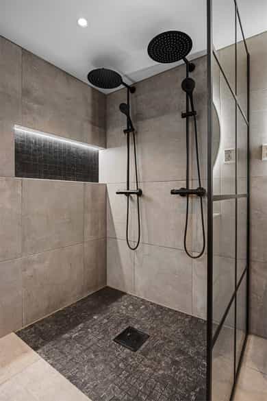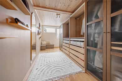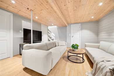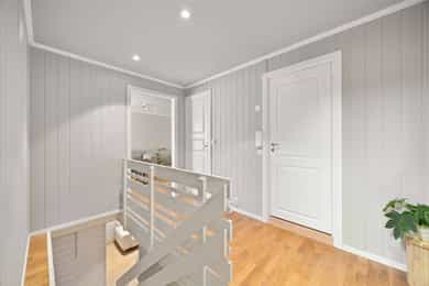 1. etasje: Lys og trivelig stue med vedfyrt peis og utgang til stor terrasse på ca. 20 m². Praktisk kjøkken med god skapplass og delvis integrerte hvitevarer. I tillegg finner du moderne bad fra 2024 med innfellbare dusjvegger, vegghengt toalett og lekre detaljer, samt eget vaskerom i samme stil med plass til vaskemaskin, tørketrommel og varmtvannsbereder. Underetasje: Tre gode soverom, romslig kjellerstue, bod og nytt lekkert spabad (2024) med både dusj og badekar. Fra hovedsoverommet er det utgang til balkong og trapp videre ut.