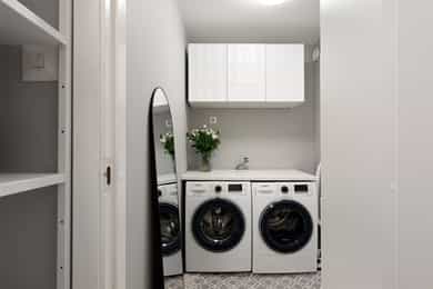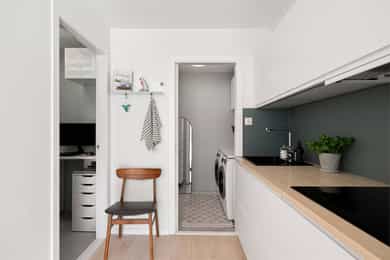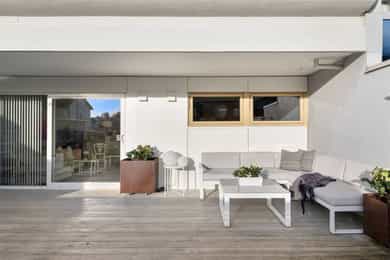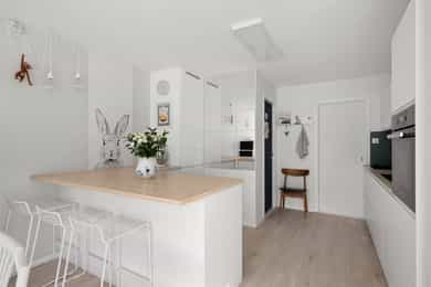 Lys og romslig endeleilighet Moderne og gjennomført uttrykk Stilrent kjøkken med gode hvitevarer Solrik og lun terrasse med god plass til utemøbler Ekstra oppbevaring i to boder Flislagt bad med varmekabler Eget vaskerom, praktisk i hverdagen Parkeringsplass i lukket garasjeanlegg Ettertraktet beliggenhet med kort vei til alt