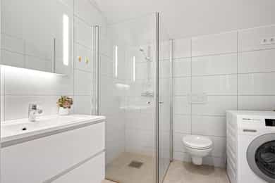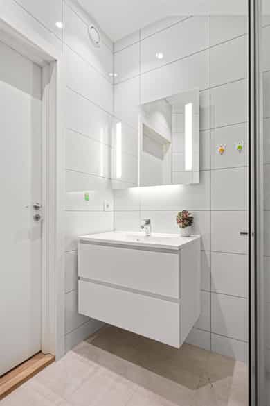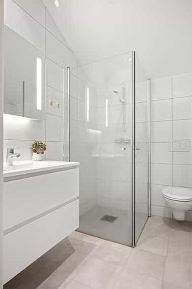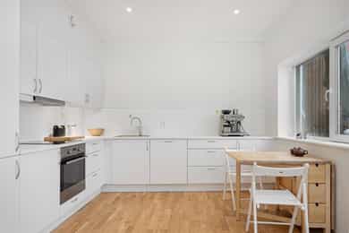 • Moderne med hvitmalte flater, eikeparkett og downlights.