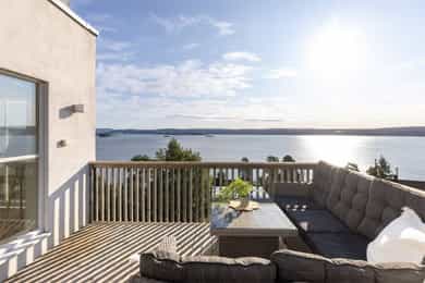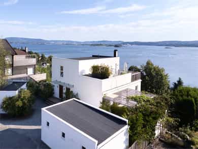 Spesielt flott funkishus fra 2014. En eiendom av de sjeldne med fantastisk utsiktstomt, stor garasje og andel i badehus