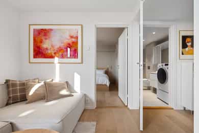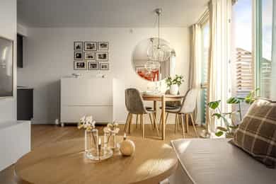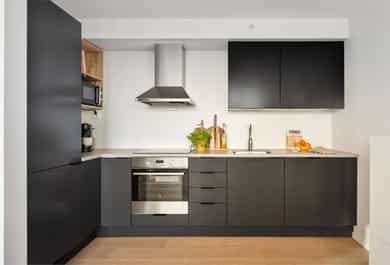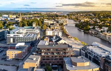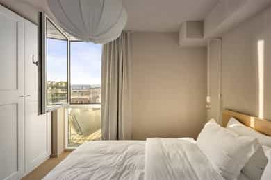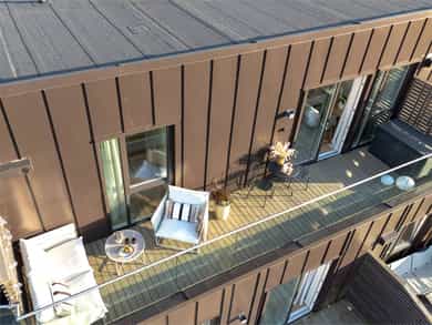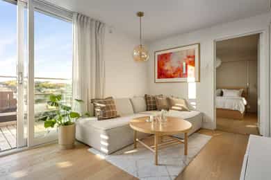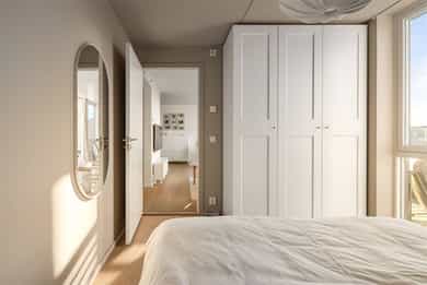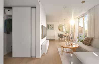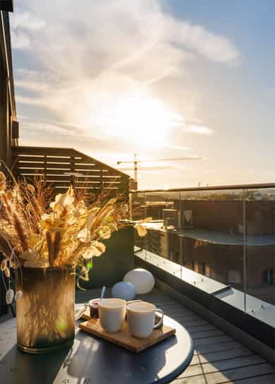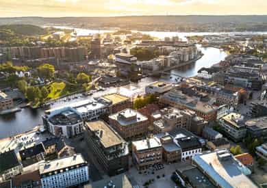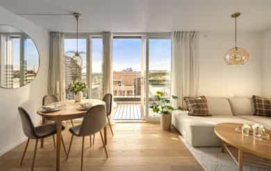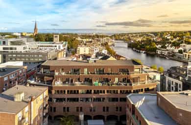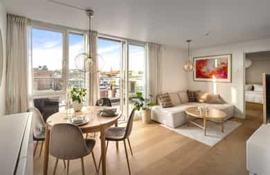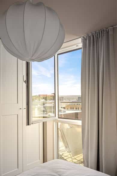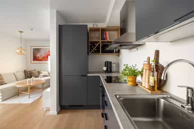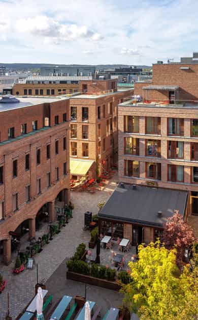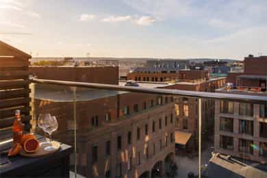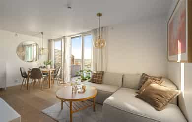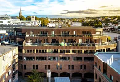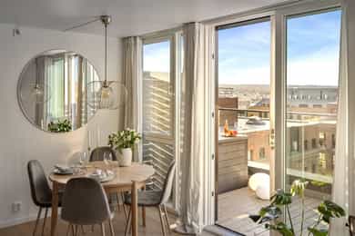 Midt i Fredrikstad sentrum finner du Dr. Giebelhausens gate 1, i en velholdt, teglkledd bygård fra 1974 der de nedre etasjene rommer skole og næring. Bygget fikk to nye etasjer i 2019. Leiligheten ligger i 6. etasje, og den 17 kvm store terrassen gir magisk utsikt over byen og solnedgangen. Nedenfor ser du den vakre, prisbelønte Nygaardsplassen og dens utvalg av gode barer og restauranter, og like ved venter Fredrikstads berømte elvepromenade med en tettpakket rekke av spisesteder og et yrende båtliv om sommeren. De enveiskjørte gatene rundt har lite trafikk, og oppe i høyden er det uansett fredelig. Leiligheten fra 2020 er moderne og behagelig med lyse, delikate flater i gode materialer. Plassen er smart utnyttet, og det hviler en åpen og uanstrengt atmosfære over boligen.