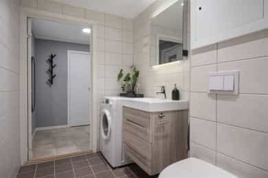 Entré: Leiligheten har en fin beliggenhet i byggets 6. etasje med enkel heisadkomst fra felles inngangsparti. Romslig entré med flislagt gulv, malte veggflater og plass for oppbevaringsmøblement. Adkomst til praktisk bod med gode oppbevaringsmuligheter. Leiligheten disponerer i tillegg en kjellerbod på ca. 2,5 kvm. Stue: Lys og fin stue med store vindusflater og utgang til balkong. Stuen har 1-stavs laminat og malte veggflater. Stuen er skjermet for innsyn og får rikelig med naturlig lysinnslipp fra store vindusflater. Leiligheten har vinduer og balkongdør med 3-lags isolerglass fra 2019. I 2021 ble tak og vegger malt, og i stuen ble det montert skreddersydde plisségardiner på vindu og balkongdør. Det ble også montert nye stikkontakter og ledninger i stue, soverom og gang. Laminatgulv og lister ble lagt nytt i 2024. Rommet har god plass til sofagruppe, spisebord, mediemøbler og oppbevaring. Fra stuen er det utgang til en nordvestvendt balkong på ca. syv kvm. Balkongen har idyllisk utsyn og fin ettermiddags- og kveldssol. Den er overbygget og romslig, med god plass til utemøbler, grill og beplantning. Skjermet, rolig og tilbaketrukket beliggenhet mot skog. I forbindelse med fasaderehabiliteringen i 2019 ble balkonggulvet avrettet og påført polyuretanbelegg. Det ble også montert nytt glassrekkverk og stående panel av varmebehandlet termofuru. Kjøkken: Kjøkkenet ligger i åpen løsning mot stue, sammen utgjør de et åpent og fint allrom. Delikat og tidløst kjøkken fra 2024 med integrerte hvitevarer og plass for spisebord. Lyst og gjennomført med profilerte skapfronter, samt benkeplate og bakplate i stein. Induksjonstopp og underlimt oppvaskkum. Kjøkkenet er praktisk utformet med gode oppbevaringsmuligheter. Kjøl- fryseskap, stekeovn og oppvaskmaskin er integrert i innredningen. IKEA kjøkken og hvitevarer er nytt fra 2024. Bakplate- og kjøkkenbenk er fra Noremax/ Easy stone/ Granitop og er laget av granitt/ stein/ kompositt. Bad: Romslig og tidløst bad med elektriske varmekabler i gulv og downlights i himling. Badet ble rehabilitert i regi av borettslaget i 2018. Innredet med vegghengt toalett og en moderne baderomsinnredning med lysspeil. Dusjhjørne med innfellbare glassdører. Opplegg og plass for vaskemaskin. Vaskemaskin medfølger. Soverom: Usjenert og fint soverom med gode lysforhold og fint utsyn. Gode oppbevaringsmuligheter i medfølgende garderobeskap. Soverommet har i likhet med resten av leiligheten, laminatgulv og slette, malte veggflater. I taket er det montert brede, dekorative taklister og takrosett med struktur.