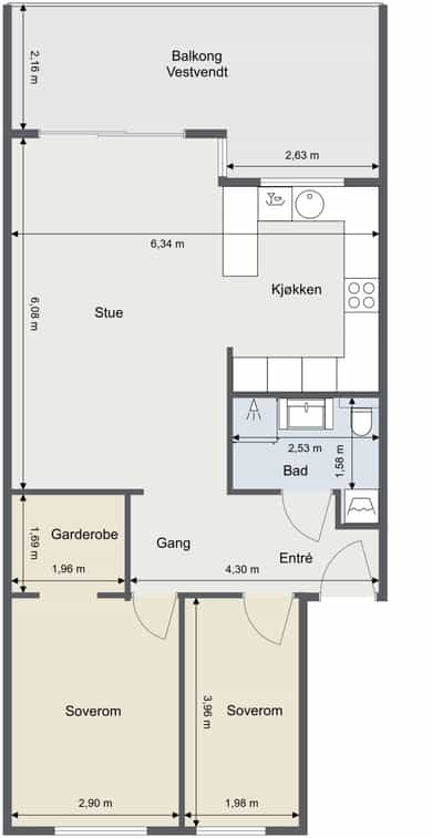 BRA-i: 68 kvm. Entré, bad, stue/kjøkken, soverom, soverom 2 og garderobe.