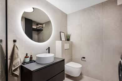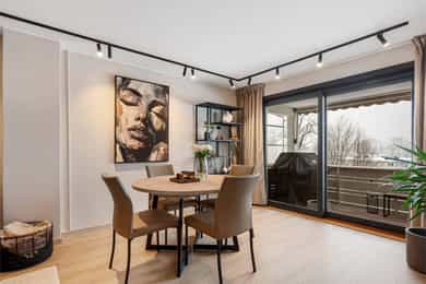 Borettslagets utearealer er pent opparbeidet, og man ønskes velkommen inn via et overbygget inngangsparti. Leiligheten har enkel adkomst og fremstår svært attraktiv, med kun få trappetrinn opp til 1. etasje. Entréen er romslig og oversiktlig, med adkomst til alle boligens rom. Det er montert spottskinne i himlingen, og på gulvet ligger lyst 1-stavs laminatgulv som gir et moderne uttrykk. Gangen har god plass til knaggrekke og skoskap bak døren, i tillegg til garderobeskap og sjenk som gir rikelig med oppbevaringsmuligheter. Stuen er leilighetens naturlige samlingspunkt, med utforming som gir god plass til både sofagruppe og spisestue. Store vindusflater slipper inn rikelig med naturlig lys, og via en stor skyvedør er det utgang til en vestvendt balkong på 15 kvm. Balkongen er flislagt og utstyrt med markise, og byr på gode møbleringsmuligheter for både spisegruppe og sitteplasser. Her kan ettermiddags- og kveldssolen nytes sammen med flott utsikt mot Oslofjorden og stemningsfulle solnedganger. Leiligheten har en svært god intern beliggenhet som endeleilighet i den nederste blokken. Kjøkken og spisestue ligger i en åpen og sosial løsning, naturlig avgrenset av en kjøkkenøy som tydelig definerer romsonene. Det stilrene kjøkkenet har glatte, sorte fronter kombinert med lys laminatbenkeplate med nedfelt kum. Innredningen byr på god skap- og benkeplass, både i underskap og i kjøkkenøya. Bak platetoppen er det montert glassplate som gir et moderne uttrykk og gjør rengjøringen enkel. Integrerte hvitevarer består av stekeovn, platetopp, oppvaskmaskin, separat kjøleskap og fryseskap integrert i kjøkkenøya. Badet har adkomst fra gangen og fremstår moderne og delikat. Rommet er flislagt med stilrene 60 x 60-fliser på både gulv og vegger, mens dusjsonen er utført med mosaikkfliser. Dusjhjørnet er avskjermet med glassvegg, og er utstyrt med både tak- og hånddusj i sort armatur. Videre er badet innredet med veggmontert toalett, servantseksjon med bollevask og rundt speil med belysning. I nisje er det opplegg for vaskemaskin, samt et skap som gir praktisk oppbevaring. Boligen har to romslige soverom, begge med plass til dobbeltseng og garderobeløsning. I tilknytning til hovedsoverommet finnes et praktisk omkledningsrom som gir ekstra oppbevaringsmuligheter. Soverommene er vendt mot øst og er skjermet for kveldssolen. For oppbevaring disponerer boligen en bod i borettslagets fellesarealer. Innvendige overflater: - Vegger med malte flater og fliser. - Gulv med laminat og fliser. - Malte flater i himling. Tekniske installasjoner: - Rør-i-rør system. - Avløpsrør i plast. - Det er utført rørfornying i hele borettslaget i 2024/25. - Naturlig ventilasjon. - Spalteventiler i vinduer. - Varmtvannsbereder på 120 liter, plassert i kjøkkeninnredning. - Elanlegg med automatsikringer. - Varmekabler i gulv på bad.