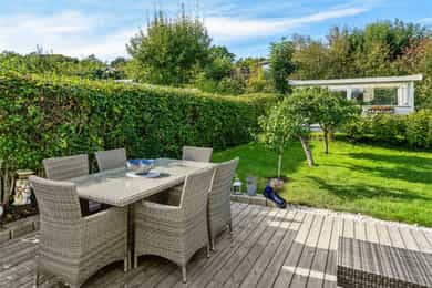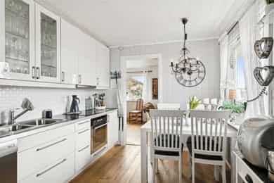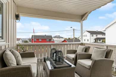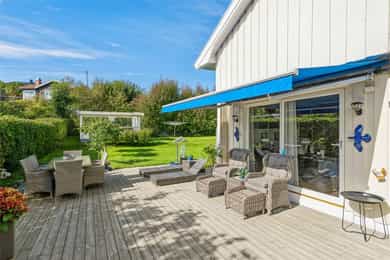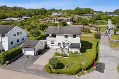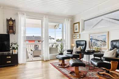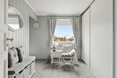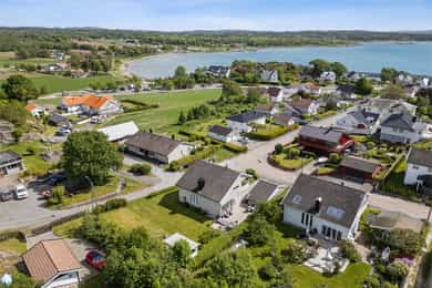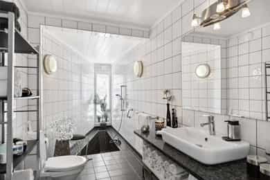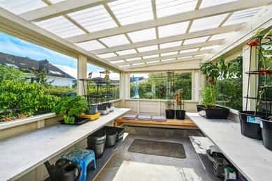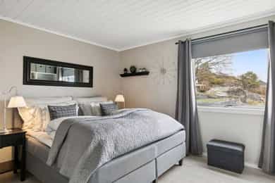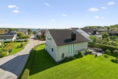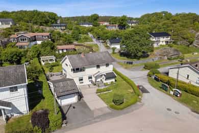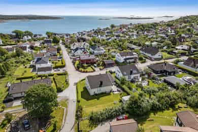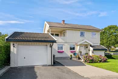 Nå gleder jeg meg til å ta deg med på en guidet tur gjennom denne flotte boligen. Dette er en bolig som man ser er eldre, men som har blitt godt ivaretatt og utviklet over veldig mange år. SÅ her finner du litt av alt. Og kanskje noe av det beste er tomta den ligger på. Her får du kroker og kriker som god deg sol, eller skygge, vind eller le, og kroker der du kan sitte i fred. Noen ganger skal jo livet leves med beina høyt mens ungene får springe rundt i gode trygge omgivelser. Dette er litt gamledager, bare det er 2025. Før vi går inn så har du selvfølgelig sett at garasjen ligger i flukt med boligen, og at det er et skikkelig digg drivhus på eiendommen. Husk at slike drivhus er like smarte for å dyrke vekster i, som de er å nyte sommeren allerede fra Mars, April. Inn med skinnfellen, gode stoler og noe godt i koppen. Vipps så har du en sommer som starter 2 mnd tidligere og avsluttes like før nissen kommer. Bli med på en tur gjennom boligen. Vi starter med en overraskende romslig entre som gir deg plass til veldig plass til familiens mange sko og jakker! Praktisk med et gjestetoalett her ute også. Og som du kjapt ser så er det her i gangen du kan gå enten ned til kjelleren eller opp til 2 etg. Fra entreen kommer du rett inn på et gedigent vaskerom med plass til alt og litt til. Dette er alle barnefamilers drømmerom, for her er det plass til mye. Når parkdressene skal tørkes, hunden spyles eller når våtdraktene skal henges opp. Her kan barnevogna stå og klargjøre seg for neste dag, og du vil fortsatt ha massevis av plass igjen. Det er også et praktisk kjølerom her inne. Slike rom blir man nesten avhengige av, når man man først har eid ett tidligere. Her bærer man kasser med brus inn, hele kaker og du kan gjøre innkjøp når ting er på tilbud. Rett og slett både i tiden og praktisk. Videre innover finner vi på høyre side 3 soverom. Det vil si at det er 3 dører til 2 rom, for dagens eiere slo inn en vegg for å åpne opp til 2 store rom , istedenfor 1 stort og 2 små. Men du er bare en liten lettvegg fra og ha 3 rom på rekke og rad, hvorav det innerste rommet er hovedsoverommet. I et av de andre rommene får du også en praktisk walk-in garderobe Rett ovenfor soverommene finner du badet som er av den lekne sorten. At det er romslig og flislagt er ikke noe du ikke har sett før, men formen på det som går over i en trekant eller spiss om du vil. Her finner du et plasstøpt, flislagt og nedsunket badekar i en trekantform. Det er også her du står å dusjer. Normalt er det ikke, men det er veldig morsomt og veldig praktisk da. For du kan jo stå og dusje med vann til livet om du ønsker. Og du har et badekar som er dypere enn alle andre kar du har vært oppi. Skal innrømme at jeg likte det, det er litt klasse over det hele Så kommer du frem til denne etasjens stue som igjen gir deg utgang til den deilige uteplassen. Dette rommet blir jo preget av en hel vegg med glass og skyvedør, men du kan med enkle grep også stjele litt plass her for å lage soverom nr 4 om du ønsker det. Eller som jeg ville gjort. Jeg ville hatt dette her som mitt hovedsoverom med den luksusen at på de varme sommernettene skøyv jeg bare opp hele døra og lot inne bli til ute. Og når hanen gal kunne jeg tusle ut på den relativt usjenerte uteplassen for en morgenkaffe. Valget er ditt. Rommet er stort og kan gi deg mye mer enn bare en stue slik det er i dag. La oss ta turen opp i husets toppetasje Så fort du kommer opp ser du at her må du nesten invitere hele storfamilien for denne etasjen er noe for deg selv. Og den er karakteristisk med sine skråtak på den ene siden. Her oppe får du en massiv stue med mange soner, samt et lukket kjøkken. Slik dagens eiere har valgt og bo så har man plass til sofagruppe og godstoler til høyre, og det er også her man har utgangen til den overbygde verandaen som gir deg både sjøgløtt og morgensol. Dette verandaen her kan jeg garantere deg at du kommer til å elske. Videre bortover i stua kommer du til plassen der spisestua står, og her ser du at du kan ha et meget langt langbord begge veier. For du har mye plass og ta av, både i kvadratmeter og i lengde. Det blir litt uansett hvordan du setter spisebordet så vil det se naturlig ut. Denne etasjen fortjener og liker store møbelgrupper. Du kan sågar ha en egen TV-krok avskilt fra resten av stua, ved kjøkkenet Helt innerst finner du det delikate kjøkkenet som kommer til å gi deg timesvis med hygge. For det er noe med det å kunne lukke døra bak seg når du skal kokkelere. Eller det å kunne sette seg ned ved kjøkkenbordet for en brødskive med gulost når du skal fundere på hva dagen kommer til å bringe med seg. Skal du ha et mer modere inntrykk og romløsning, så tror jeg du kommer til å åpne opp den ene kortveggen som går mot spisestua. Da får du fortsatt en delvis lukket kjøkken, men en mer sosial layout. Som jeg tidligere nevnte så har denne etasjen karakteristiske skråtak på den ene siden. Det gir deg en bolig med stil og karakter, i tillegg til at du får en litt mer overraskende og leken planløsning. Så her oppe har dagens eiere også gjort plass til en kontorkrok uten og stele noe plass fra resten av stua. Og ønsker du deg ikke et hjemmekontor akkurat her oppe så er den plassen up for grab til veldig mye annet rart. Her er det den hyggeligste lesekroken. Det kan bli til en del av en TV-stue eller du kan gjøre det om til en seriøs voksen bod. Du har så mange muligheter ved denne planløsningen. Nå kan man egentlig si at dette her var hus nok for en familie, men vi har enda en etasje igjen. La oss ta turen ned 2 etasjer og ende opp i kjelleren som har et meget stort potensial, mye større enn hva dagens bruk er. Ja hva skal jeg egentlig si at denne kjelleren inneholder? For det er nesten misbruk av god plass og ikke ha utviklet dette her mye mer. Du kommer først ned i en gang som leder deg inn til en bod der du har mange tekniske løsninger og der