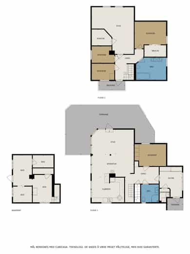 Hjemmet går over 3 plan og inneholder: Underetasje: Grovkjeller med 5 boder. 1.etasje: Stue, kjøkken, ett soverom, bad, vaskerom, gang og vindfang. 2.etasje: Tre soverom, bad, loftstue, walk-in garderobe og bod. Frittstående vedsjå med tilbygd garasje. Lekestue i hage.