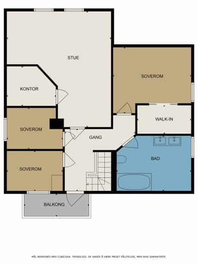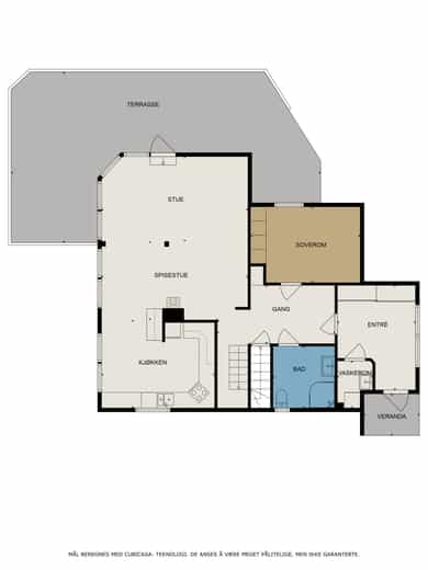 BRA-i: 97 kvm. Stue, kjøkken, bad, vaskerom, ett soverom, gang, trapperom og vindfang.