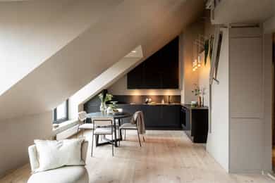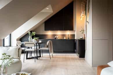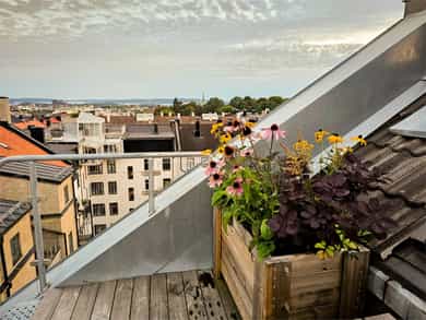 Leiligheten ligger i 5. etasje og inneholder entré, åpen stue- og kjøkkenløsning, soverom, bad og hems. I tillegg disponerer leiligheten en en kjellerbod på 5 kvm. Entré Velkommen inn til en lys og innbydende entré som gir et velfortjent godt førsteinntrykk av boligen. Her er plassen godt utnyttet med hylleløsning for å henge fra seg yttertøyet. Stue Rålekker stue med store vindusflater som gir en luftig romfølelse. Boligen bærer preg av moderne fargervalg og gode materialer, med gjennomtenkte løsninger, heltre furugulv og smakfulle detaljer. Gulvet ble slipt i 2026. I stuen er det god plass til å innrede med sofa og spisebord. Kjøkken Kjøkkenet er fra 2018 og har innredning med glatte fronter og benkeplate i stein. Det er integrerte hvitevarer samt montert komfyrvakt og vannstoppsystem. Kjøkken og stue er i en åpen, sosial løsning. Soverom Romslig soverom med god skapplass i skyvedørsgarderobe. Fra soverommet er det utgang til trapp som fører opp til den private takterrassen. Takterrassen byr på gode solforhold fra kl. 09.30-19.30. Fra takterrasse har du en flott utsikt Bad Badet er opplyst etablert i 2018. Rommet har flislagte gulv, fliser og malte flater på vegger, elektriske varmekabler, nedsenket dusjsone og vegghengt toalett. Det er mekanisk avtrekk. Hems Fra stuen er det trapp opp til hemsen. Hemsen er innredet med soverom, og passer også ypperlig som ekstra stue, hjemmekontor eller gjesterom.