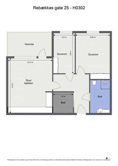 BRA-i: 64 kvm. Entré/gang, bod, bad, soverom, soverom 2, stue/kjøkken