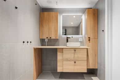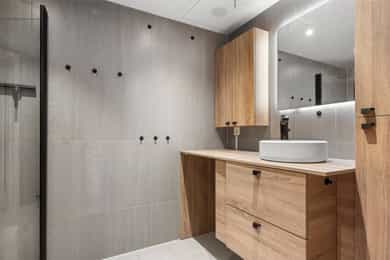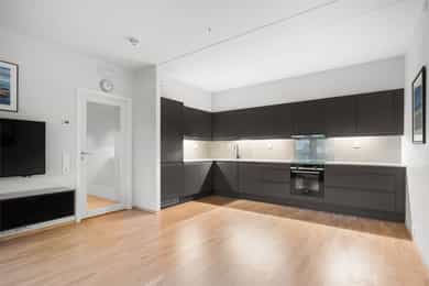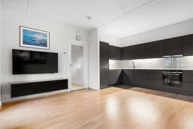 Innbydende og pent opparbeidede fellesarealer ønsker velkommen, med overbygd inngangsparti, porttelefon heisadkomst til leiligheten. Vel innenfor møtes du av en lys gang med downlights i himlingen og knagger for oppheng av yttertøy, samt adkomst til praktisk bod med gode oppbevaringsmuligheter. Leiligheten har gjennomgående lys 3-stavs eikeparkett og slette, malte vegger og himlinger. Vannbåren gulvvarme i alle rom sørger for jevn og behagelig oppvarming, mens balansert ventilasjon bidrar til et godt inneklima hele året. Det åpne stue- og kjøkkenrommet fungerer som leilighetens naturlige samlingspunkt og har god plass til både spisebord og sofagruppe. Generøs takhøyde i kombinasjon med store vindusflater gir en lys og luftig romfølelse. Fra stuen er det utgang til en uteplass på 10 kvm. Balkongen er belagt med terrassebord som gir en lun atmosfære, og er utstyrt med markise for solskjerming samt varmelampe som forlenger utesesongen. Leiligheten har en fin intern beliggenhet, hvor nærheten til vannet gir en ekstra kvalitet i hverdagen. Kjøkkenet er plassert i en funksjonell L-form i det åpne oppholdsrommet og fremstår stilrent og tidløst. Her er det rikelig med skap- og benkeplass i over- og underskap. Innredningen har slette, mørkegrå fronter kombinert med lys keramisk benkeplate, som gir en elegant kontrast. Integrerte hvitevarer består av stekeovn, platetopp, oppvaskmaskin samt kombiskap for kjøl og frys. Badet har adkomst fra gangen og fremstår som moderne og funksjonelt. Rommet har flislagte vegger og gulv, behagelig gulvvarme og downlights i himlingen. Badet er nylig oppgradert med ny baderomsinnredning, ny servant og ny dusjløsning. Innredningen består av dusjhjørne med glassvegger, veggfestet toalett samt stilren baderomsinnredning med skuffer og benkeplate. Over servanten er det speil med integrert belysning. Videre er det røropplegg for vaskemaskin og avtrekk tilknyttet balansert ventilasjon. Leiligheten har to soverom, begge med adkomst fra gangen. Hovedsoverommet har god plass til dobbeltseng og byr på gode oppbevaringsmuligheter i skyvedørsgarderobe, i tillegg til ekstra garderobeskap. Soverom nummer to er fleksibelt og egner seg godt som barne- eller gjesterom, alternativt hjemmekontor. Rommet har skyvedørsgarderobe samt et plassbygget skap som gir praktisk oppbevaring. Innvendige overflater: - Vegger med slettmalte flater og fliser. - Gulv med 3-stavs eikeparkett og fliser. - Slettmalte flater i himling. Tekniske installasjoner: - Vannledninger i boligen utført i plast i rør-i-rør system med fordelerskap i himling på bad. - Plast avløp. - Boligen har etablert balansert ventilasjon. - Felles varmesentral. Varmefordeling med vannbåren gulvvarme. - Varmefordeling ved vannbåren gulvvarme i hele leiligheten. - El-anlegg fra 2019. - El-skap med jordfeilautomater. Montert overspenningsvern.