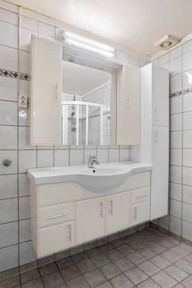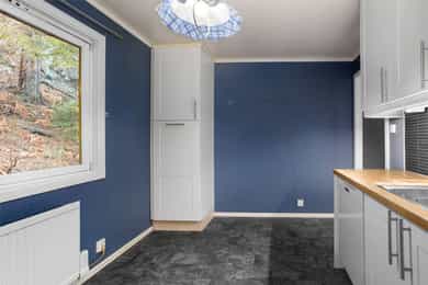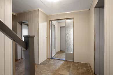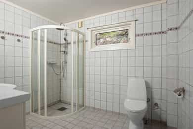 Boligen fremstår som et oppussingsobjekt med mange muligheter. Innvendige overflater Gulv: - Fliser. - Furu. - Parkett. - Laminat. Vegger: - Tapet. - Trepanel. - Malte plater. - MDF-plater. - Brystningspanel. Himling: - Trepanel. - Malte plater. - Takessplater. Bad Gulv og vegger er belagt med fliser, og himlingen består av malte plater. Sluket er av type plast. Sanitærutstyr og innredning: - Innredning med nedfelt servant. - Vegghengt speil. - Dusjvegg-/hjørne. - Toalett. Avtrekk via elektrisk vifte. Vaskerom Gulvet består av støpt betong, og veggene er av leca og sponplater. Sluk av type plast. Sanitærutstyr og innredning: - Utslagsvask. - Opplegg for vaskemaskin. Naturlig ventilering. Kjøkken Innredning: - Profilerte fronter. - Benkeplate av heltre. Hvitevarer: - Komfyr. - Kjøl/fryseskap. - Oppvaskmaskin. Det er kjøkkenventilator med avtrekk ut Toalettrom Gulvet er av parkett. Vegger og himling av trepanel. Sanitærutstyr og innredning: - Toalett. - Servant. Naturlig ventilering.