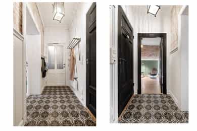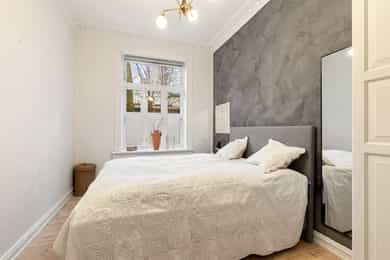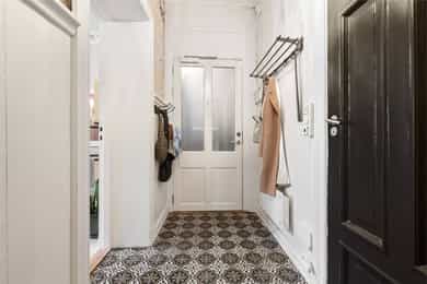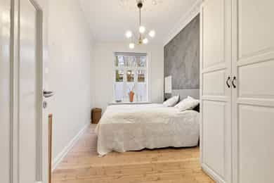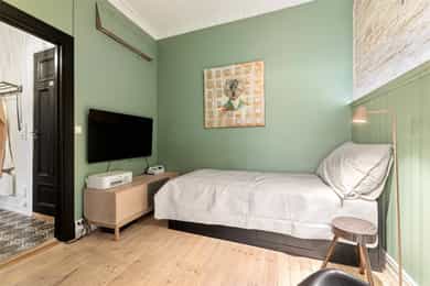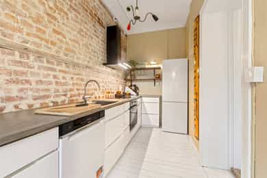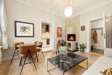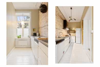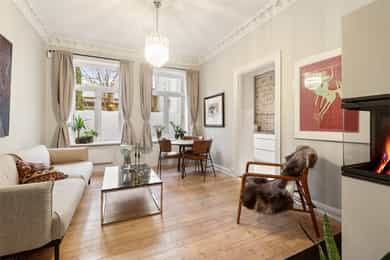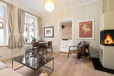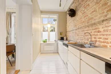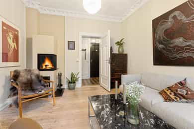 Entré: Velkommen inn! I leiligheten møtes du av en lys og flott gang som gir et godt førsteinntrykk. I gangen er det plass til knagger og skohylle for oppbevaring av yttertøy. Det er lagt historiske fliser med varmekabler og gangen har en synlig teglsteinsvegg som gir særpreg. Entréen har en sentral plassering i leiligheten, som sikrer god flyt. Videre er det dørcallinganlegg med porttelefon. Kjøkken: Separat, moderne og sjarmerende kjøkken. Tidsriktig innredning fra 2020 med glatte fronter, benkeplate i tre og teglsteinsvegg over kjøkkenbenken. Underlimt oppvaskkum i stål med ettgrepsarmatur. Hvitevarene består av integrert platetopp og stekeovn og frittstående kjøleskap og oppvaskmaskin. Det er kullfiltervifte over stekesonen. Det er rikelig med skap- og benkeplass. Stue: Leiligheten har en herlig stue med flotte, klassiske detaljer. I stuen er det god plass til sofagruppe med tilhørende sofabord og tv-møblement. Planløsningen oppleves naturlig og gjør innredningen enkel. De store vindusflatene, det gode lysinnslippet og den generøse takhøyden på hele 3 meter gir en god og luftig romfølelse. De dype, tidstypiske vinduskarmene er perfekt for planter og dekor. Leiligheten ligger i en ærverdig bygård fra slutten av 1800-tallet, de originale detaljene med nydelig rosett og stukkatur er bevart. Videre sikrer den moderne peisen behagelig, vedvarende varme og skaper hyggelig stemning på kalde høst- og vinterkvelder. Ifølge tidligere salgsoppgaven ble peisen montert i 2011. Overflatene er velholdte med originalt tregulv og veggene er nylig malt i en behagelig fargetone. Soverom: Lyst, innbydende soverom av god størrelse. Det er god plass til dobbeltseng, nattbord og garderobeskap/kommode. Rommet har stort vindu som sikrer godt med lys og luft. Soverommet har både rosett og stukkatur i himling. Kontor: Det er etablert et ekstra rom i gangen ved å sette opp en lettvegg. Rommet passer godt som kontor eller gjesterom. Rommet har tregulv samt teglstein og panel på vegger. Bad: Tidløst, pent bad fra 2006 med flislagte overflater og elektrisk gulvvarme. Badet er innredet med dusjsone med åpen dusj, gulvstående toalett og baderomsinnredning med skap, overlimt servant med ettgrepsarmatur fra Damixa og veggskap med speil og lys. Det er opplegg for vaskemaskin. Overflater: Gulv: Originalt tregulv og flislagt gulv på badet. Vegger: Malt overflate/panel på vegger, synlig teglsteinsvegg og fliser på badet. Selger opplyser at vegger og himling nylig er malt. Himling: Malt overflate i himling. På soverommet er takhøyden oppmålt til 3,01 meter.