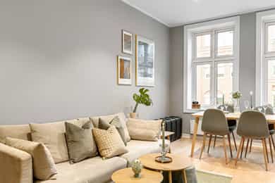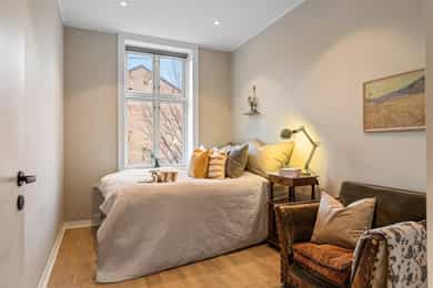 Leiligheten ligger i et svært populært og urbant område midt på Grünerløkka, en av Oslos mest levende og karakteristiske bydeler. Her bor du med umiddelbar nærhet til et rikt kulturliv, sjarmerende kafeer, anerkjente restauranter, nisjebutikker og et bredt utvalg av servicetilbud. Alt du trenger i hverdagen – fra dagligvarebutikker til kollektivtransport – finner du rett utenfor døren. Rekreasjon og grøntområder Området byr på vakre parker og rekreasjonsmuligheter. Bare en kort spasertur unna finner du Sofienbergparken, Olaf Ryes plass, Birkelunden og Kubaparken, som alle pulserer av liv, særlig på varme sommerdager med arrangementer, konserter og markeder. Ønsker du å trekke deg tilbake fra bylivet, er Akerselva perfekt for søndagsturer – enten du vil gå nordover mot Nydalen, Frysja og Maridalsvannet, eller sørover til Bjørvika og Operaen. Nærområdet tilbyr også fotballbaner, basketballbaner, lekeplasser, idrettshaller, svømmehall og skaterampe. Restauranter, kaféer og uteliv Grünerløkka er et mekka for mat- og kaffeelskere. Innen få minutters gange finner du blant annet Le Benjamin, Ching-Ching og Sabrura. Rundt Schouskvartalet kan du nyte rustikk italiensk hos Trattoria Popolare eller asiatisk crossover hos Südøst. Schouskjelleren byr på spennende øltyper i intime omgivelser, mens Bettola serverer kreative drinker i retrostil. Flere gode alternativer er Markveien Mat & Vinhus og Dr. Kneips vinbar. Lenger opp på Løkka finner du Parkteatret – en klassiker for konserter og kulturopplevelser – og burgerfavoritten Munchies, kjent for sine saftige burgere og avslappede atmosfære. Kaffekjennere vil sette pris på Tim Wendelboe sitt berømte kaffebrenneri i Fossveien. Tar du turen over Akerselva, er det kort vei til Vulkan-området med Mathallen, et mangfoldig matmarked og flere serveringssteder. I tillegg finner du DOGA (Design og Arkitektur Norge) og Kulturkirken Jakob, som byr på varierte kulturelle arrangementer. Et steinkast unna ligger også BLÅ, et ikonisk utested ved elven som byr på konserter, utendørs servering og kulturelle happenings året rundt. Alternativt kan du nyte solen på uteserveringen hos Syng, eller besøke kinoen på Ringnes Park. Dagligvare og shopping Det er flere dagligvarebutikker i nærområdet, som KIWI, Rema 1000 og Bunnpris. I tillegg bugner området av små bakerier, delikatessebutikker og kaffebarer hvor du kan starte dagen i rolig tempo. Grünerløkka er også kjent for sitt spennende utvalg av vintagebutikker, interiørbutikker og spesialforretninger, hovedsakelig konsentrert rundt Markveien og Thorvald Meyers gate. Ønsker du mer shopping, er det kort vei til Grønland, Torshov, Storo, St. Hanshaugen samt Oslo sentrum med Oslo City og Byporten. Kollektivtilbud Området har et svært godt kollektivtilbud. Trikk 17 og buss 30/31 går fra Trondheimsveien, mens trikk 11, 12 og 13 går fra Schous plass. Det er også gangavstand til Oslo Sentralbanestasjon, som er Oslos største kollektivknutepunkt med tilgang til tog, t-bane, trikk og buss.