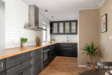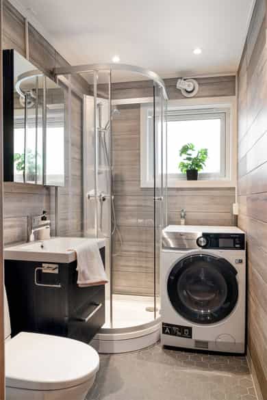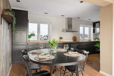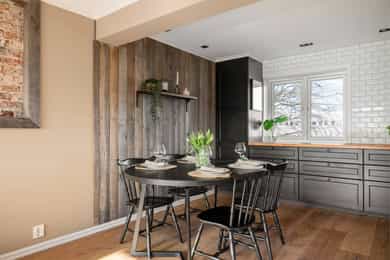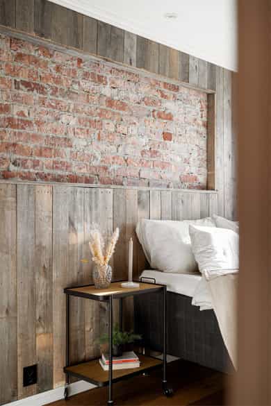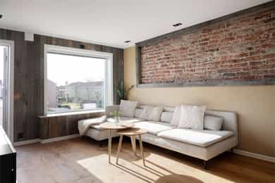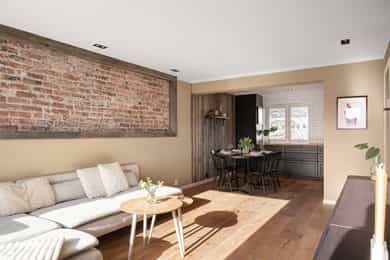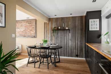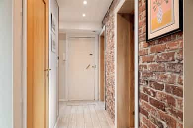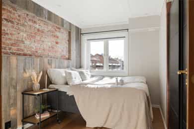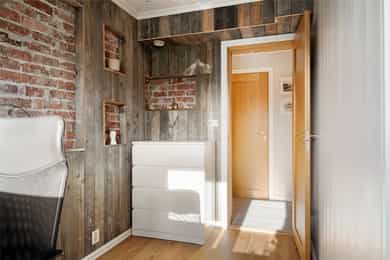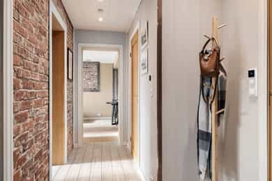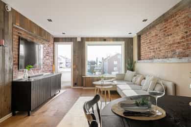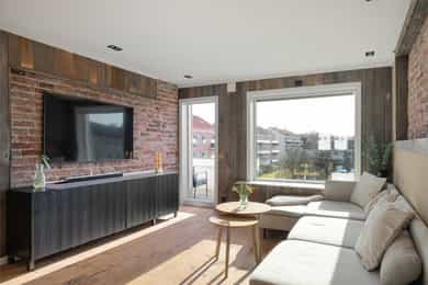 Leiligheten gjennomgikk en betydelig oppussing i 2017, hvor de fleste overflater ble revet ned og bygget opp på nytt. Teglsteinen ble eksponert, og i kombinasjon med treverk, gipsvegger og røff enstavs laminat på gulvene fremstår boligen i dag som stilren og gjennomført. Entré med plass til å henge fra seg yttertøy. Fra gangen er det adkomst til et praktisk garderoberom/bod. Leiligheten har to soverom, begge med garderobeløsning. Det ene soverommet er i dag innredet som kontor. Stuen er romslig og har god plass til både spisegruppe og sofagruppe. Herfra er det direkte utgang til leilighetens sørvendte balkong, som har gode solforhold. Kjøkkenet ble åpnet opp mot stuen i 2017 for å skape en mer åpen og luftig romfølelse. Kjøkkenet har sort innredning med profilerte fronter og heltre benkeplate. Det er integrerte hvitevarer som kjøleskap, oppvaskmaskin, platetopp og stekeovn, samt rikelig med skap- og skuffeplass. Badet ble pusset opp i 2017 og fremstår tidløst med fliser på gulv og vegger samt varmekabler i gulvet. Badet er innredet med servantskap, speil, toalett og dusjkabinett. Det er også opplegg for vaskemaskin. Leiligheten har gode oppbevaringsmuligheter med bod både i kjeller og på loft. Innvendige overflater: Innvendig er det gulv av laminat og fliser. Veggene har trepanel, teglstein og malte plater. Innvendige tak har malte plater. Etasjeskiller er av betongdekke. Det er foretatt stikkprøver mtp høyde avvik. Med stikkprøver menes noen rom/deler av etasjen. Det vil mao kunne være avvik uten at dette har blitt målt. I de tilfellene der det ikke er avvik over 15mm blir ikke målinger beskrevet i rapporten ettersom det ikke ansees som ett avvik ihht NS3600. Innvendig har leiligheten fyllingsdører. Teknisk: Vannledninger på bad. For nærmere kontroll av rør(faglig, teknisk og lovlighet) må rørlegger kontaktes(Se også tekst under "Gjelder spesielt for denne rapporten"). Det er avløpsrør av støpejern. Leiligheten har mekanisk ventilasjon. Det gjøres oppmerksom på at det ikke er gjennomført en teknisk kontroll av ventilasjons/avtrekksanlegget. For en teknisk gjennomgang av funksjon, styrken på avtrekk osv må egnet firma kontaktes. Det er sentralanlegg for varmt vann.