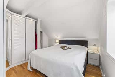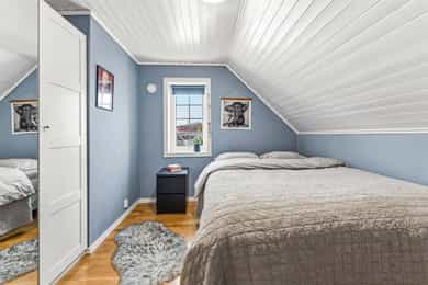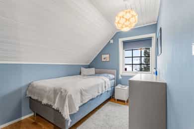Dette er en unik mulighet på fantastiske Volla! Dette er en pen og velholdt familiebolig over to plan i attraktivt og meget sentralt strøk. Herfra er det kun 10 minutter til togstasjon, og kort vei til buss. Tomten er opparbeidet med stor flott, skjermet hage, og med steinsatt gårdsplass. På tomten finner du også en praktisk sportsbod for oppbevaring av gressklipper, sykler og annet hageutstyr. Velkommen til visning på denne flotte boligen! Entré Boligen har adkomst via trapp opp til et overbygget inngangsparti. Innenfor ytterdøren møtes man av en romslig entré med behagelig gulvvarme. Gulvet er belagt med fliser i grå nyanser, kombinert med grå panelte vegger og naturfarget tak med integrerte downlights. Skyvedørsgarderobe gir gode oppbevaringsmuligheter og bidrar til en ryddig og funksjonell entré. Det er montert nye spotter utvendig over inngangspartiet i 2023. Kjøkken Kjøkkenet er boligens naturlige knutepunkt og har åpen løsning mot både trappegang og stue. Rommet har skipsgulv med gulvvarme, hvitmalt panel på vegger og downlights i taket. Kjøkkeninnredningen består av flere seksjoner med takhøye overskap som gir rikelig med lagringsplass. Innredningen har et klassisk uttrykk med hvite profilfronter, åpne hyller, vitrineskap og heltre benkeplater i en fargetone som harmonerer med gulvet. Det er dobbel oppvaskkum i benk, mørke fliser på vegg i bakkant og integrerte hvitevarer. Kjøkkenet er oppgradert med nytt blandebatteri (2021), integrert kjøleskap (2021), ny platetopp (2023) og integrert oppvaskmaskin (2025). Stue Stuen er et trivelig samlingsrom med gjennomgående dagslys og utgang til terrasse. Rommet har enstavs parkett på gulv med gulvvarme, downlights i tak og veggpanel malt i dempede farger. Pipemuren er kledd med grå fliser, og rommet har en sentralt plassert klebersteinsovn. Stuen varmes i tillegg opp av varmepumpe, som har hatt årlig service, og rommet byr på gode soner for både sofa- og spisestuemøblement. Loftstue Loftstuen gir mulighet for et sosialt avbrekk og er holdt i lyse farger. Det er malt tregulv, naturfarget tak, lave knevegger og vindu som gir godt med dagslys. Rommet har plass til sofa, kontorplass og tv-møblement. Bad / wc / vaskerom Boligen har ett bad og et separat wc-rom. Badet ligger i andre etasje og er utført med fliser i harmonerende farger, gulvvarme og downlights i panelt tak. Dusjløsningen er oppgradert med dusjkabinett i 2023, og tidligere glassvegg er fjernet. Badet er videre utstyrt med vegghengt toalett og egen vaskeromsdel med nisje for vaskemaskin og tørketrommel. Innredningen er kirsebærfarget og består av servantinnredning, flere veggskap, hylle samt speil med overlys. Soverom og garderobe Eneboligen har tre gode soverom i andre etasje, hvorav de to minste har gulvvarme. Det er garderobeskap på to av soverommene. Innvendig kledning i garderobeskap rundt pipe i 2. etasje er fjernet i 2024. Boligen har også god lagringsplass i en stor, oppgradert bod i garasjen samt en uisolert bod ved terrassen.
