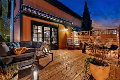 Boligen har også en sørvestvendt terrasse på ca. 24 kvm med terrassebord. Terrassen har elektrisk markise og ligger usjenert bak levegg og bod.
