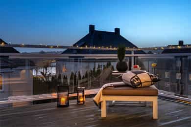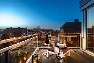 Leiligheten ligger i 3. etasje, altså øverst. Vinduene har varierende alder fra 70-80-tallet og det nyeste fra 2013. Mot sør finner vi en romslig terrasse med moderne rekkverk av glass og stål og et vedlikeholdsfritt kebonygulv som føles godt under føttene. Her har du god plass til en sittegruppe om du for eksempel ønsker å spise middag ute, og mellom nabohusenes tak ser du ut mot elven og Isegran, og mot øst nyter du også utsikt mot deler av Gamlebyen - en åpen og deilig uteplass. Rundt hjørnet, mot vest, finner vi dessuten en liten overbygd luftebalkong. Her strekker utsikten strekker seg forbi byens fineste villaer ut mot Kråkerøy og kveldssolen mellom grenene til en stor, frodig blodbøk.