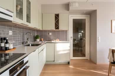 - Entré - Innbydende entré som gir et umiddelbart godt førsteinntrykk. Downlights i himling og parkett på gulv. Det er godt med oppbevaringsplass i en pen og praktisk garderobeløsning. - Åpen stue- og kjøkkenløsning - Stuen og kjøkkenet er i en åpen og romslig løsning med flott utsyn, samt utgang til en herlig og solrik balkong på ca. 9 kvm. Med naturlige "soner", rene og delikate fargevalg og optimale lysforhold med mye naturlig lysinnslipp, har rommet en meget lun og behagelig atmosfære. Tidløst kjøkken fra Norema med moderne kvaliteter og utførelse. Det er integrerte hvitevarer fra Siemens, fliser mellom under- og overskap, laminat benkeplate og godt med lagringsplass i skuffer og skap. Det er god plass til sofaseksjon, tv, bord og øvrig interiør i tillegg til en hyggelig spisegruppe. - Soverom med walk-in og "hotellfølelse" - Fra entréen er det adkomst til et delikat og innbydende soverom med praktiske og lekre garderobeskap som rammer inn sengeplassen. Fra soverommet er det også direkte adkomst til en bod som er innredet som et "walk-in- closet". - Flislagt og moderne baderom - Leiligheten har et romslig og lekkert baderom med gulvvarme og opplegg til vaskemaskin. Badet er ellers utstyrt med baderomsinnredning med servant, speilskap m/lys, dusjhjørne med svingbare glassdører, vegghengt klosett og balansert ventilasjon. Oppsummert er dette en fantastisk leilighet med gjennomgående høy standard. Det er gjennomtenkte løsninger, kvaliteter og fargevalg som gjør dette til en bolig du vil trives godt i.