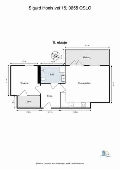 Leiligheten ligger i 6. etasje og inneholder entré, soverom, bod, bad og stue/kjøkken med utgang til en nordvestvendt balkong på ca. 9 kvm. Boligen disponerer i tillegg en kjellerbod på ca. 5 kvm. Det gjøres særskilt oppmerksom på at bod som er medtatt som BRA-e og i totalt BRA ligger på fellesareal, men disponeres av denne leiligheten.