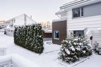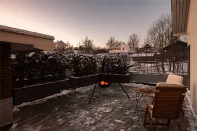 Moderne familiebolig med flott solrik uteplass i hyggelig sameie med felles oppvarmet basseng! 3 sov, peis, og garasje.