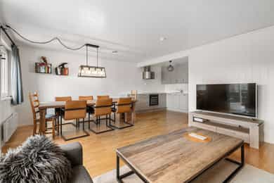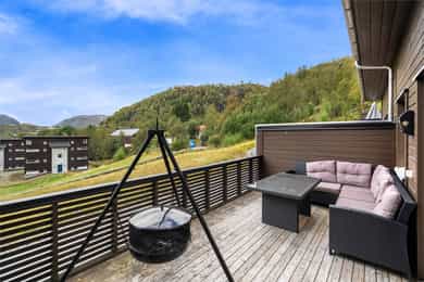 Moderne fritidsbolig med privat ski- og aketrekk rett utenfor døren. Solrikt og barnevennlig. 2 stuer og 2,5 bad.