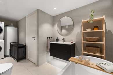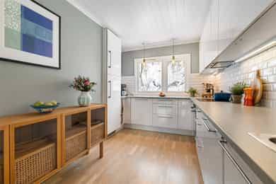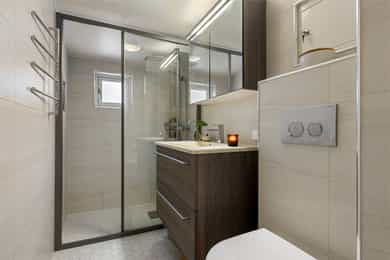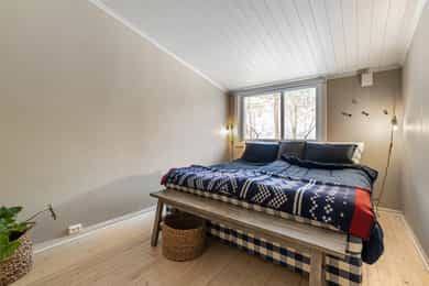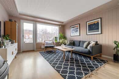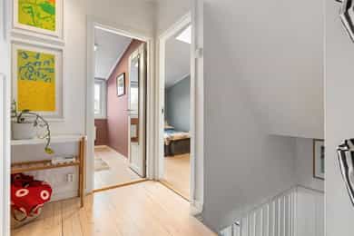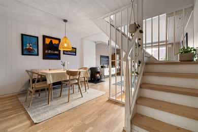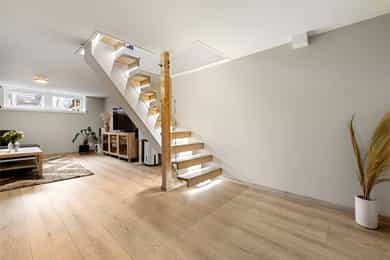 Entré Innbydende entré med plass til ytterklær og sko i plassbygd skyvedørsgarderobe. Gulv med fliser og varmekabler. Stue Sosialt og gjennomgående oppholdsrom med plass til spisestue og sofa. Kjøkkenet er i åpen løsning med fin plassering mot stuen. Koselig vedovn som gir en lun stemning. Parkett på gulv. Fra stuen er det utgang til sydvendt terrasse på ca. 16 kvm og koselig hage. Kjøkken Tidløst kjøkken med glatte fronter og laminat benkeplate med nedfelt oppvaskkum. Kjøkkenet har rikelig med skap- og benkeplass, og er utstyrt med integrert platetopp, stekeovn og oppvaskmaskin. Ventilator over kokeplass med avtrekk ut. Det er varmefolie i gulvet. Bad 2. etasje Moderne, flislagt bad med elektrisk gulvvarme. Badet er innredet med vegghengt klosett, baderomsinnredning med heldekkende servant, speilskap og dusjvegg. Elektrisk styrt vifte. Badet ble totaloppusset i 2015, og silikonfuger er byttet november 2025. Bad kjeller Lekkert baderom fra 2020 med fliser på vegger og gulv, samt elektrisk gulvvarme. Badet er innredet med vegghengt klosett, baderomsinnredning med heldekkende servant, speil og badekar. Det er opplegg for vaskemaskin. Elektrisk styrt vifte. Soverom Det er totalt 3 soverom - alle med god plass til seng og tilhørende møblement. Tregulv i 2. etasje.