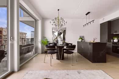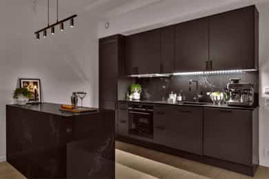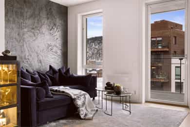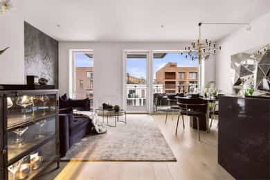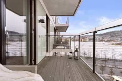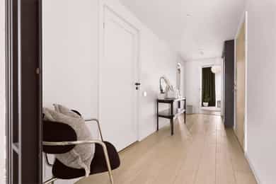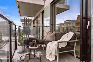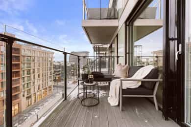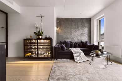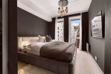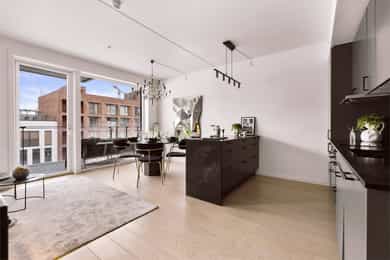 Entré: Velkommen inn! Entréen er lys og romslig, med gode oppbevaringsmuligheter i tilhørende skyvedørsgarderobe. Det er også plass til ønsket møblement som kommode eller konsollbord. Stue: Lys og innbydende stue med store vindusflater som gir rikelig med naturlig lys. Fra stuen er det utgang til en hyggelig balkong på 7 kvm med nydelig utsikt mot Ekeberg og Munchmuseet. Stuen ligger i åpen løsning mot kjøkkenet og har god plass til både sofagruppe og spisebord. Kjøkken: Flott moderne kjøkken med innredning bestående av glatte fronter og benkeplate i stein. Kjøkkenet er praktisk utstyrt med integrerte hvitevarer og ventilasjon via byggets sentrale avtrekksanlegg. Den lekre kjøkkenøya med benkeplate i stein gir ekstra arbeids- og oppbevaringsplass i romslige skuffer. Et sosialt og funksjonelt kjøkken med fint utsyn mot spisestue og balkong. Hovedsoverom med walk-in garderobe: Romslig og delikat hovedsoverom med plass til dobbeltseng og nattbord. God oppbevaringsplass i tilhørende walk-in-garderobe. Store vindusflater sørger for godt lysinnslipp og en luftig atmosfære. Soverom 2: Et fleksibelt rom som egner seg godt som gjesterom, barnerom eller hjemmekontor. Her er det plass til seng, garderobeskap og skrivebord etter behov. Bad: Moderne flislagt bad med elektrisk gulvvarme. Innredningen består av veggmontert wc, nedsenket vask med innredning og speil, nedsenket dusjnisje med glassdører og opplegg til vaskemaskin og tørketrommel. Det er balansert ventilasjon med avtrekk i himling og friskluft via spalte i dør/terskel. Innvendige overflater: Innvendig er det gulv av parkett. Veggene har malte plater og betong. Innvendige tak har malte plater og betong. Innrammede dører av malt tré.
