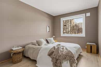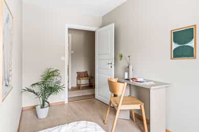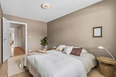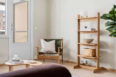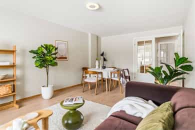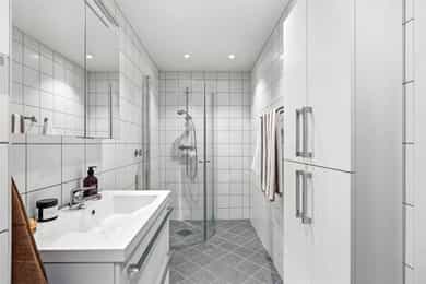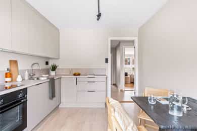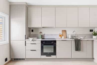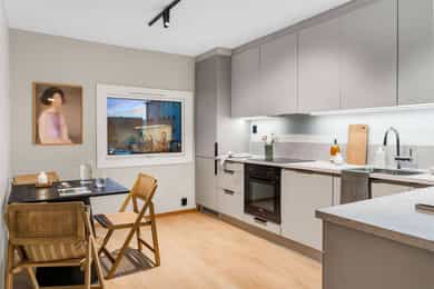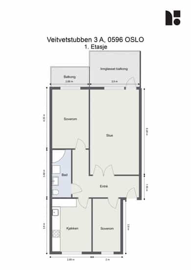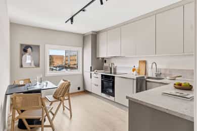 Entré Leiligheten har adkomst via felles trappegang til første etasje. Entréen er innbydende og sørger for et godt første inntrykk. Leiligheten er pusset opp i 2025-2026 med nye flater og nytt elektrisk anlegg. I entréen er det god plass til å innrede med garderobeskap og øvrig møblement. Stue Stuen er et sosialt oppholdsrom hvor du fint får plass til både sofagruppe og spisebord. Stort vindu og utgang til balkong gir naturlig lystilførsel til rommet og bidrar til en hyggelig atmosfære. Fra stuen har du tilgang til en innglasset balkong på ca. 8 kvm tilknyttet balkong på ca. 6 kvm. Kjøkken Kjøkkenet ligger i eget rom. Praktisk utformet og har rikelig med skap- og benkeplass. Den stilrene kjøkkeninnredningen fra HTH har beige fronter og laminat benkeplate med nedfelt kum i rustfritt stål. Her er det gode flater å jobbe på. Kjøkkenet har integrerte hvitevarer fra Siemens. Varmtvannsbereder på 110 liter fra 2018 er plassert i innredning. Bad Badet ble pusset opp i 2018 i regi av borettslaget. Det er grå fliser på gulv, hvite fliser på vegger, downlights samt gulvvarme. Innredningen består av servantskap, matchende veggskap og speilskap med belysning. Videre er badet utstyrt med dusjhjørne med innfellbare glassvegger og opplegg for vaskemaskin. Soverom og lagring Det er to soverom i leiligheten, begge av god størrelse og i hver sin ende. Det er god plass til dobbeltseng, tilhørende møblement og garderobeskap. Det disponeres to kjellerboder på totalt ca. 6 kvm for ekstra oppbevaringsbehov.