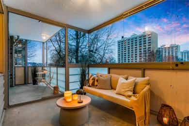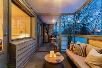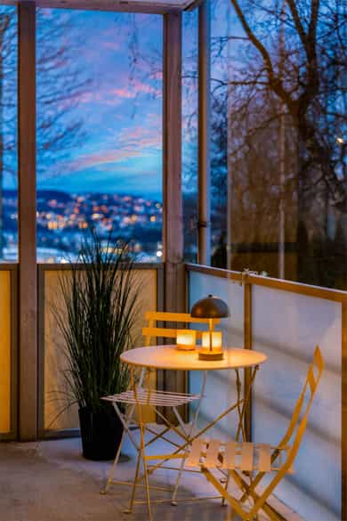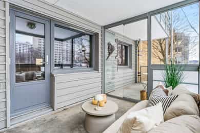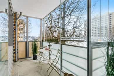 Fra stuen er det utgang til en innglasset balkong på ca. 8 kvm. Balkongen har gode solforhold med vestvendt beliggenhet. Det er mulig å åpne deler av innglassingen og skyve den til siden, eller lukke igjen om man vil ha det lunere. Ettersom at balkongen er innglasset kan den nytes store deler av året. I forbindelse med denne er det også tilgang til en balkong på ca. 6 kvm.