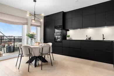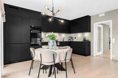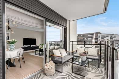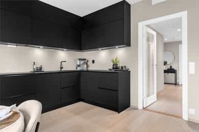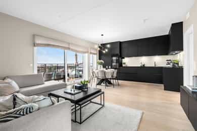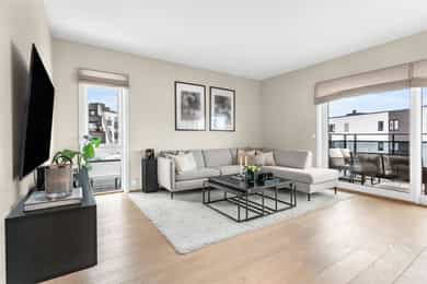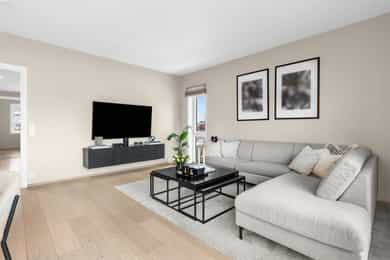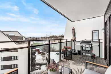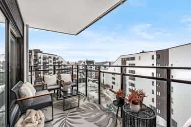 Lys 4-roms endeleilighet i 6.etg med 3sov, 2bad, nytt kjøkken (2021), vestvendt balkong, heis, garasje med el-lader.