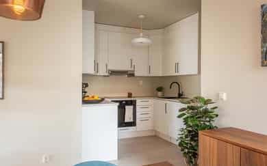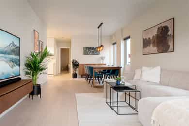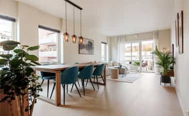 Nordvik har gleden av å presentere en lys og attraktiv 3-roms hjørneleilighet i 6. etasje med heis, balkong og bruksrett til garasjeplass med elbillader. Leiligheten har en arealeffektiv og gjennomtenkt planløsning med stue og kjøkken i åpen løsning, to soverom, bad og entré, samt en innvendig bod. Balkongen vender mot et rolig uteområde og har behagelig morgensol. Kværnerbyen byr på en sentral, urban og grønn livsstil med kort vei til både Barcode, Sørenga og flotte turstier mot Ekeberg. Høydepunkter: Balkong mot rolig uteområde Bruksrett til garasjeplass i kjeller IN-ordning Felles takterrasse i Turbinveien 7 Alt inkl. i FK: internett, kabel-tv, varmtvann, fyring Gode kollektivforbindelser Rolig og sentralt boligområde