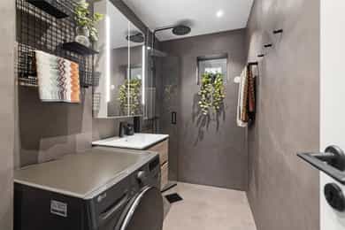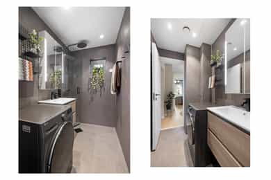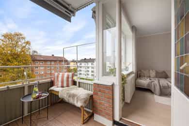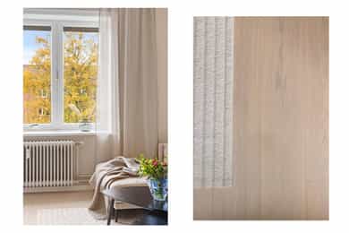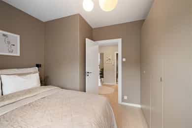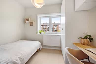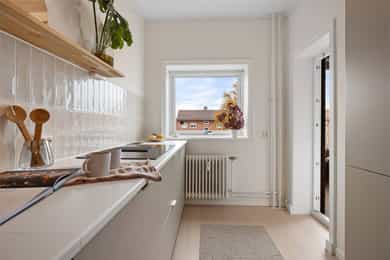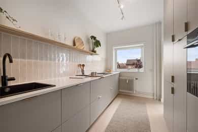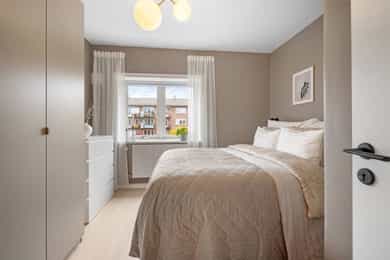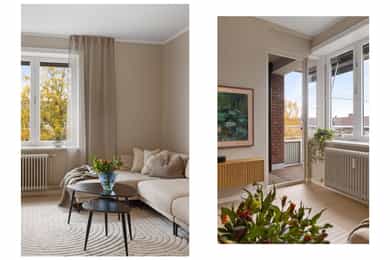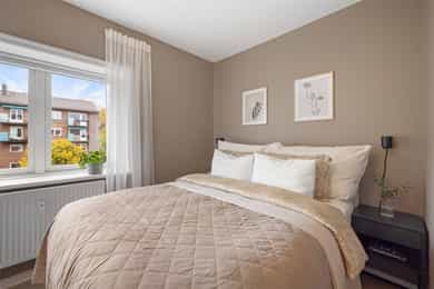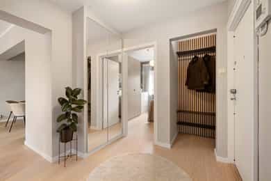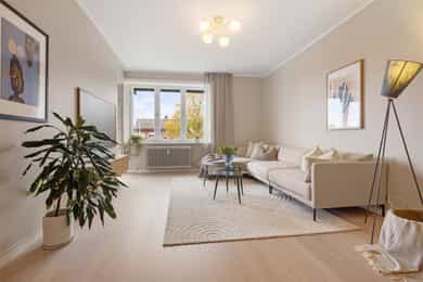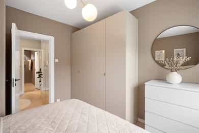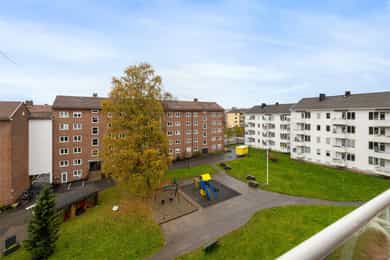 Entré: Velkommen inn! Her har du en gjennomført og moderne 3-roms leilighet i nordisk stil. Leiligheten ble i stor grad pusset opp i 2024 med fokus på kvalitet i alle ledd og skreddersydde løsninger. I gangen er det to innebygde skap (montert i 2024) for oppbevaring av sko og yttertøy. I tillegg er det en stilig, åpen garderobenisje med knagger og skohylle. Her er det en moderne spilevegg. Entréen har en sentral plassering i leiligheten, som sikrer godt flyt mellom rommene. Kjøkken: Separat, moderne og stilsikkert Ikea-kjøkken fra 2024. Tidsriktig innredning med glatte fronter, fliser på veggen over kjøkkenbenk og benkeplate i laminat. Sort oppvaskkum med svingbart blandebatteri. Det er integrerte hvitevarer som består av kjøl/fryseskap, oppvaskmaskin, stekeovn og platetopp med integrert kullfiltervifte. Kjøkkenet er utstyrt med komfyrvakt og vannstopper. Kjøkkenet har et tidsriktig uttrykk med masse lagringsplass og godt med benkeplass for matlaging. Det er utgang til balkongen. Stue: Den lyse, luftige stuen inviterer til både avslapning og sosiale sammenkomster, med plass til både stor sofa og spisegruppe. Stilrene overflater pusset opp i 2024 med pent, herdet tregulv fra Bjelin (type Eik Vistorp XXL 27,2 cm brede bord) og veggene ble sparklet og malt i en lun fargetone. Stuen oppleves luftig og åpen med godt lysinnslipp via store vindusflater og god takhøyde på 2,65 meter. Rommet har en velutformet planløsning som gjør innredningsjobben enkel. Fra stuen er det utgang til en solrik balkong på 5 kvm. Her er det god plass til utemøblement, grill og beplantning. Balkongen er vestvendt og stikker i tillegg noe ut fra bygningskroppen. Selger opplyser at det er sol fra midt på dagen (12-tiden) og frem til solen går ned bak Holmenkollen på kvelden (om sommeren). Med bakgrunn i at leiligheten ligger i 4. etasje og bygget er høyere enn bygningene i sør og vest, gir dette optimale solforhold. Det er hyggelig utsikt mot borettslagets grøntområder. På balkongen er det markise og nye balkongheller. To soverom: Leiligheten har to gode soverom. På hovedsoverommet er det god plass til dobbeltseng, nattbord og garderobeskap. Soverom 2 passer godt som barnerom, gjesterom eller hjemmekontor. Her er det plass til seng, skrivepult og skap/kommode. Det ble satt inn nye innerdører på soverommene i 2024. Bad: Rålekkert bad overflateoppusset i 2021. Badet har overflater som består av mikrosement på gulv og vegger, malte plater med downlights i himling og behagelig gulvvarme. Badet er utstyrt med dusjhjørne med innfellbar dusjdør, blandebatteri med regndusj og håndholdt dusj, samt baderomsinnredning med skuffer, servant med blandebatteri og veggmontert skap med speilfronter. Det er opplegg for vaskemaskin. Badet er opprinnelig fra 2006. Separat toalett: Praktisk, separat toalett med adkomst fra gangen. Rommet har mikrosement på vegger og gulv, og er utstyrt med veggmontert toalett og hvit, vegghengt servant. Overflater: Gulv: Herdet tregulv fra Bjelin - type Eik Vistorp XXL 27,2 cm brede bord. Mikrosement på badet og toalettrommet. Vegger: Glatte, malte vegger og mikrosement på bad og toalettrom. Selger opplyser at alle overflater (vegger, vinduer/karmer og tak) ble sparklet og malt i 2024. Himling: Malt himling. I stuen er takhøyden oppmålt til 2,65 meter.