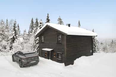 Det er to parkeringsplasser som tilhører hytten rett foran inngangen. Selger har montert Zeptec lader som styres via app. Brukes legges til automatisk på strømmen.