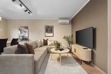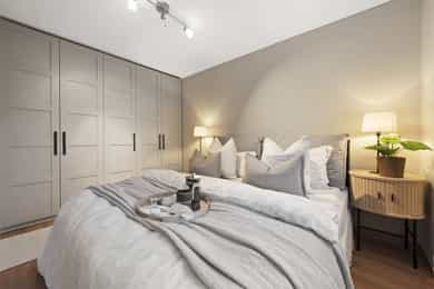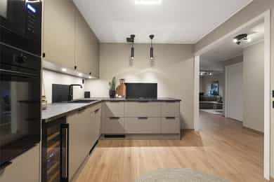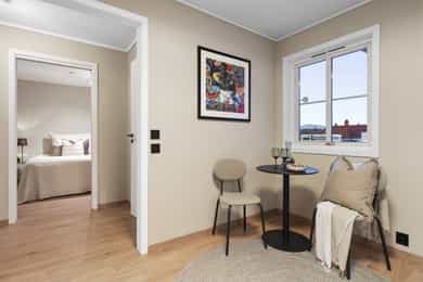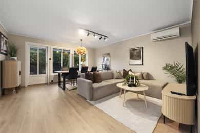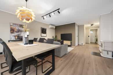 Denne lekre boligen har blitt vesentlig oppgradert i 2025 og holder en gjennomgående god standard med moderne innredninger og tidsriktige detaljer. Velkommen inn i trivelig entrè med oppbevaringsplass til sko og yttertøy. Fra entreèn kommer man inn i innbydende stue med plass til langbord, sofagruppe og annen mediemøblement. Varmepumpe og vedovn sørger for god oppvarming av stuen. Det er smartbelysning i stuen som kan styres via app eller dimmes via lysbrytere. Alle lysbrytere og stikkontakter i boligen er skiftet i 2025. Fra stuen er det utgang til vestvendt terrasse med svært gode solforhold og god plass til sittegruppe. Kjøkkenet i boligen ble totalrenovert i 2025 med lekker og tidsriktig innredning fra Norema og integrerte hvitevarer som kjøl-fryseskap, stekeovn, mikrobølgeovn, platetopp og vinkjøler. Det er god oppbevaringsplass i over- og underskap. Ved vindu er det plass til hyggelig sittegruppe. Det er to gode soverom i denne boligen. Hovedsoverom er romslig og har meget god oppbevaringsplass i lekker garderobe fra Ikea med Pax-innredning. Soverom ll har god plass til dobbeltseng, nattbord og kontorpult. Begge soverom er malt i lune og behagelige farger. Baderommet i boligen har nylig blitt oppgradert med nye fliser på gulv og ny, delikat baderomsinnredning. Det er god oppbevaringsplass i høyskap og skuffeseksjon under servant med overliggende speil med varme- og lysregulering. Ny digital termostat styrer varmekablene via touchskjerm eller digital app. For øvrig er baderommet er innredet med wc, dusjkabinett og vaskemaskin. Det er god lagringsplass i to praktiske boder - en bod i boligen og en utvendig bod ved inngangsparti. Velkommen til visning!