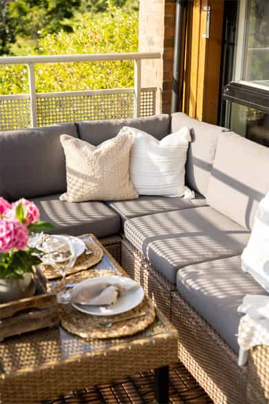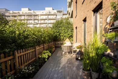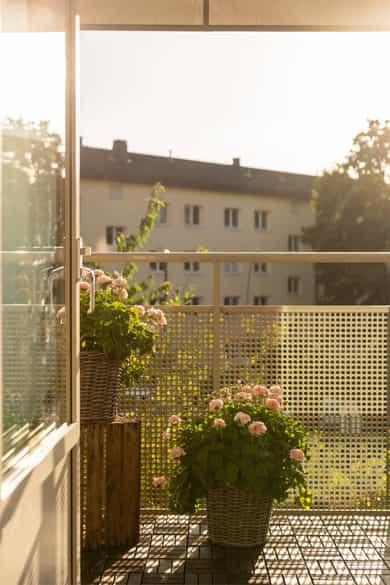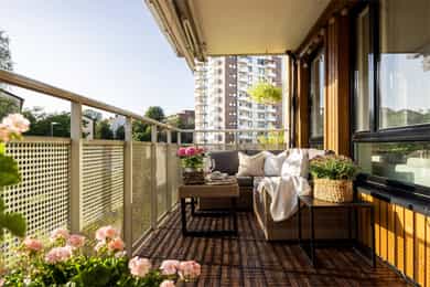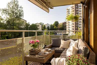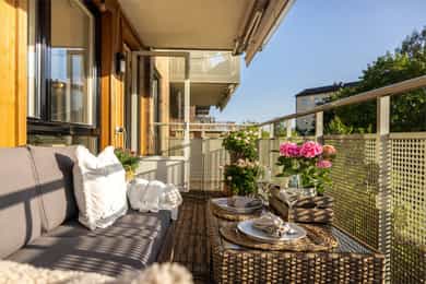Delikat 4-roms hjørneleilighet m/ 3 sov og 2 bad. Solrike uteplasser på totalt 44 kvm. Garasje m/ el. Familievennlig.