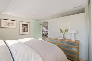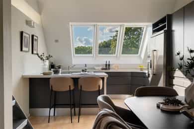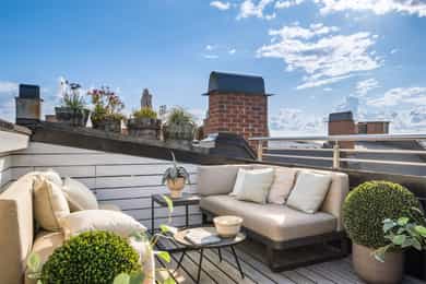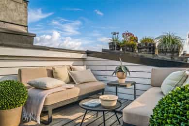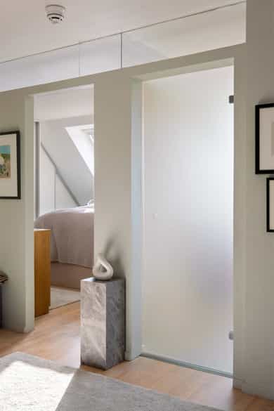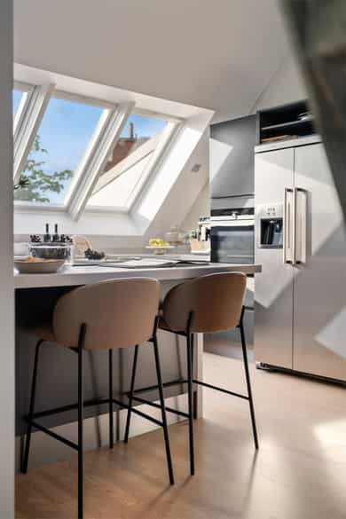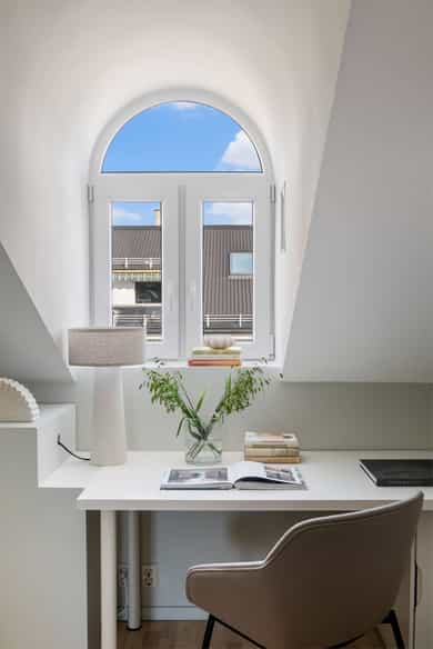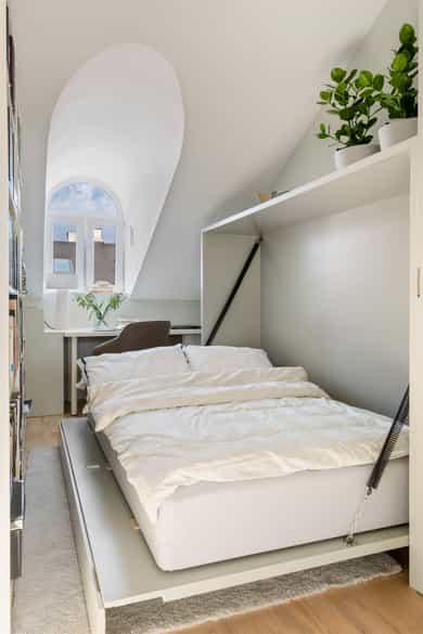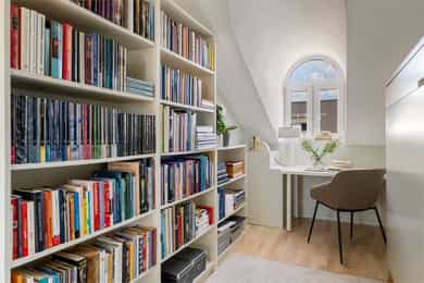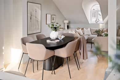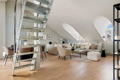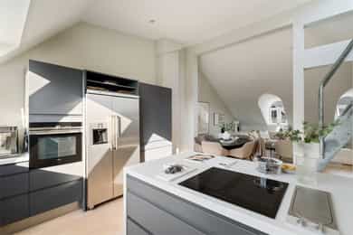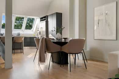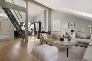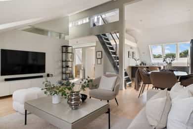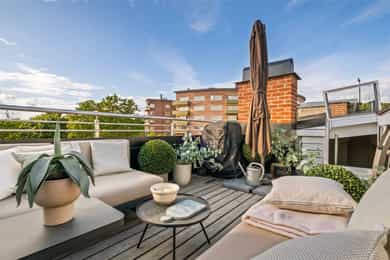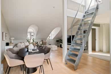 Moderne, lys og luft er noen ord som beskriver denne lekre toppleiligheten. Leiligheten var opprinnelig et råloft som har blitt ombygget av Rastad & Relling arkitektkontor til en flott toppleilighet med mye å by på! Boligen har en god planløsning som legger til rette for ulike soner og bruk. Store vindusflater sikrer gode lysforhold. Leiligheten er terskelfri, vegger i alle rom er malt i samme lyse grågrønn farge som gir en flott helhet. Her er det delikat farge- og materialvalg kombinert med en moderne innredning hvor ingenting er utelatt til tilfeldighetene. Leiligheten har et gulvareal på hele 93 kvm, så her får man godt av plass til boltre seg på. En meget pen loftsleilighet uten synlige bjelker. Entré: Entréen gir et godt førsteinntrykk av leiligheten. Her er det god plass til å oppbevare yttertøy og sko i skyvedørsgarderobe. Stue/spisestue Leiligheten oser av sjarm og trivsel med en flott finish som gjør at den fremstår som elegant og gjennomført. Den åpne løsningen mellom spisestuen og kjøkkenet gjør at dette mest sannsynlig er det rommet du kommer til å tilbringe mesteparten av tiden din. Dette rommet innbyr til både avkobling og sosialt samvær. Her er det delikat farge- og materialvalg kombinert med en moderne innredning hvor ingenting er utelatt til tilfeldighetene. Store vindusflater sammen med en generøs takhøyde på hele 3,6 m sikrer godt innslipp av lys og gir en unik og luftig atmosfære i leiligheten. Belysning med downlights i himling, gulv og vegger, samt innfelt belysning i vegg er designet for leiligheten. Privat takterrasse: Stuen har direkte adkomst til en privat og usjenert takterrasse på hele 12 kvm. Her er det sol fra tidlig morgen til sen kveld med utsikt over Oslos tak. Her er det plass til både sofaseksjon med bord og grill. Praktisk bod i tilknytning til takterrassen. Åpen kjøkken/stue løsning: Stilfull og tidløs kjøkkeninnredning fra HTH som gjenspeiler leilighetens grandiose uttrykk. Kjøkkenet har en helstøpt Corian benkeplate med støpt vaskekum, nedfelt induksjonstopp, stekeovn og oppvaskmaskin fra Siemens. Lekker nedfellbar avtrekksvifte fra Gaggenau. Kjøkkenet har rikelig med skap- og benkplass som legger til rette for en god arbeidssone samt en tilpasset barløsning for de hurtige måltidene. Soverom: Leiligheten har to gode soverom. Hovedsoverommet er av god størrelse med tilpasset graderobeløsning som sikrer utnyttelse av arealet. Soverom II har nedfellbar seng som er meget plassbesparende. Soverom II kan naturligvis brukes som et kontor, gjesterom eller barnerom. Baderom: Meget delikat baderom med tidløs fliskombinasjon. Badet er innredet med vegghengt toalett, møbelsnekret innredning med servant og armatur fra Vola, dusjhjørne med svingbar glassdør. Vaskemaskin og tørketrommel er skjult under baderomsmøblementet for å gi et bedre estetisk uttrykk. Inn til baderommet er det en glassdør i frostet som setter et ekslusivt preg. Downlights i himling. Veluxvinduene gir hyggelig utsikt og god lysforhold på badet. Bod: Leiligheten disponerer to kjellerboder på henholdsvis ca. 5 kvm og 4 kvm. Innvendig overflater: Vegger - Vegger med malte plater. Tak - Himlinger med malte plater. Takhøyden er målt til 2,49 m i entréen og 3,6 m på det høyeste i stuen. Gulv - Gulv med 3-stavs parkett. Fliser med varmekabler på bad. Selgers egne ord: "Vi vil fremheve at leiligheten er lys og luftig, og har en optimal planløsning. Dette er kvaliteter du kommer til å sette mer og mer pris på etterhvert, og i sammenligning med andre. Dersom du ønsker det, har du sol på terrassen fra morgen til kveld. Beliggenheten er optimal. Det er stille og rolig, og du har gangavstand til "hele" byen. 3 ord til slutt - tidløs, kul og spesiell!"