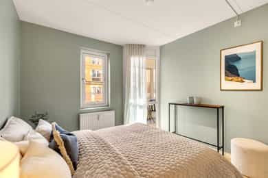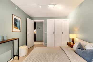 Stue-/kjøkken: Leiligheten har en romslig og innbydende stue med åpen kjøkkenløsning, som gir en sosial og luftig atmosfære. Store vindusflater slipper inn rikelig med naturlig lys og skaper en behagelig romfølelse. Det er god plass til både sofagruppe og spisebord, med en planløsning som gjør boligen enkel å møblere. Moderne og funksjonelt kjøkken med glatt, laminert innredning og laminert benkeplate. Det er integrert koketopp og stekeovn med kullfiltervifte over, samt integrert kjøl/frys og oppvaskmaskin. Videre har kjøkkenet kum med ettgreps blandebatteri og praktisk belysning under overskapene. Fra stuen er det utgang til en solrik, innglasset balkong på ca. 4 kvm. Balkongen fungerer som en naturlig forlengelse av oppholdsrommet og kan benyttes store deler av året – perfekt som en lun sitteplass eller et ekstra rom i hverdagen. Soverom: Lyst og romslig soverom med en rolig og behagelig atmosfære. Store vindusflater gir godt med naturlig lys, og rommet har god plass til dobbeltseng med tilhørende møblement. Praktisk garderobeløsning med gode oppbevaringsmuligheter. Et innbydende soverom som legger til rette for god komfort og en avslappende hverdag. Bad: Delikat og moderne bad oppgradert i 2019 med stilrene overflater i mikrosement og fliser. Badet fremstår som tidsriktig og funksjonelt, med en rolig og gjennomført fargepalett. Badet er utstyrt med veggmontert WC, servant med ettgreps blandebatteri og baderomsinnredning med gode oppbevaringsmuligheter. Dusjplass med dusjvegger gir et ryddig og luftig uttrykk. Det er opplegg for vaskemaskin, og downlights med dimmer gir behagelig og fleksibel belysning. Overflater: Gulv: Parkett i alle rom. Lite parti med fliser ved entrédør og fliser med varmekabler på bad. Vegger: Malte flater i alle rom og mikrosement på bad. Himling: Malte flater i alle rom. Takhøyden er målt til 2,38 meter i stuen.