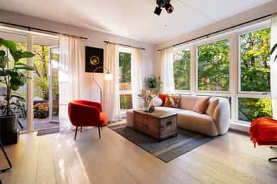 Velkommen til en strøken 4-roms endeleilighet med gjennomgående høy standard. Leiligheten har store vinduer i flere himmelretninger som gir svært gode lysforhold. Samtidig ligger leiligheten omkranset av trær, noe som bidrar til et frodig utsyn i sommerhalvåret. Leiligheten har videre tre romslige soverom, bad + ekstra toalett og en åpen stue-/ kjøkkenløsning. Her bor du sentralt, med kort vei til butikker, kafeer og kollektivtransport. Fremtredende kvaliteter: