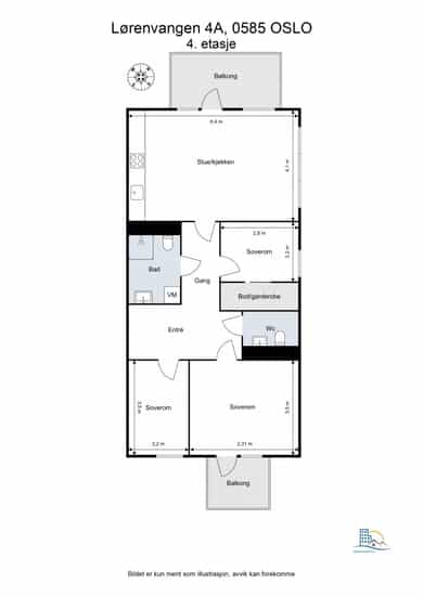 Moderne og strøken 4-R endeleilighet i bygg fra 2024. To balkonger, bad + WC, og gjennomgående planløsning. Garasjeplass