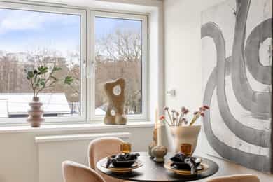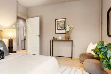 Leilighet beliggende i byggets 2. etasje. Det er adkomst via felles trappeoppgang. Oppgangen har porttelefon. Leiligheten inneholder entré, bad, soverom, kjøkken og stue med utgang til balkong. ENTRÉ: Velkommen inn! Leiligheten har en innbydende entré med downlights i himlingen, noe som skaper et umiddelbart godt førsteinntrykk. I gangen er det et praktisk innebygd skap som gir god plass til oppbevaring av yttertøy og sko. LYS OG LUFTIG STUE M/UTGANG TIL BALKONG: Stuen fremstår lys og luftig med store vindusflater som gir rikelig innslipp av naturlig lys. Den gode planløsningen gir fleksible møbleringsmuligheter, med god plass til både sofagruppe, TV-møbler og spisebord med tilhørende stoler. Gulvet er belagt med flott parkett som ble slipt og hvitoljet i januar 2026, og overflatene er sparklet og malt i delikate, moderne fargetoner samme periode. Dette gir et gjennomført og tidsriktig uttrykk, og et ideelt utgangspunkt for å innrede med egne møbler og skape et personlig og innbydende hjem. Fra stuen er det utgang til en herlig vestvendt balkong på ca. 4 m² med utsikt mot borettslagets hyggelige fellesarealer. I vår- og sommerhalvåret fungerer balkongen som en naturlig forlengelse av stuen, ideell for hyggelige stunder med familie og venner. Her er det gode muligheter for å etablere en koselig uteplass med utemøbler, beplantning og gassgrill. Balkongen ble oppført i 2014/2015. SEPARAT KJØKKEN: Separat, moderne kjøkken med god skap- og benkeplass. Kjøkkenet har glatt, laminert kjøkkeninnredning med laminert benkeplate og kum med ettgreps blandebatteri. Videre er kjøkkenet utstyrt med integrert koketopp, halvintegrert stekeovn, halvintegrert mikrobølgeovn, halvintegrert oppvaskmaskin samt frittstående kjøleskap. Over koketoppen er det kullfiltervifte. Kjøkkenfrontene ble grunnet og malt i januar 2026. SOVEROM: Soverommet er romslig, med plass til dobbeltseng, nattbord og tilhørende møbler. De lune fargevalgene på veggene, sammen med store vindusflater, skaper en lys og behagelig atmosfære. BADEROM: Pent, flislagt baderom med downlights i himlingen og gulvvarme, rehabilitert i 2012. Badet er innredet med vegghengt WC, dusjplass med inn- og utslående dusjhjørne, servant med ettgreps blandebatteri i innredning samt opplegg for vaskemaskin. OPPBEVARING: Leiligheten disponerer en loftsbod med gulvareal på ca. 5,85 m² og skråtak, med måleverdig areal på ca. 4 m², samt en kjellerbod på ca. 3 m². Det gjøres særskilt oppmerksom på at bod som er medtatt som BRA-e og i totalt BRA ligger på fellesareal, men disponeres av denne leiligheten. Overflater på gulv består av: Parkett i alle rom. Overflater på vegger består av: Malte flater i alle rom. Overflater i tak består av: Malte flater i alle rom. Downlights med dimmer i entré, på kjøkken og på stue. Takhøyde i stue på 2,48 m. ØVRIG INFORMASJON: Entrédør: Brann- og lydklassifisert entrédør. Vinduer: Trerammer med 3-lags energiglass fra 2014 i stue. Trerammer med 2-lags energiglass fra 1997. Innerdører: Hvite formpressede dører med 4 speils felt. Ventilasjon: Naturlig ventilasjon med luftespalte i vindu. Elektrisk anlegg: Sikringsskap med automatsikringer er plassert i trappeoppgang. Oppvarming: Vannbåren varme til radiatorer fra fellesanlegg og elektrisk gulvvarme på bad. Det er montert ny radiator i stue i 2014.