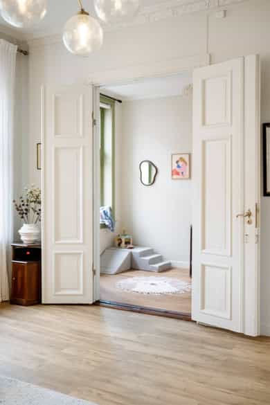 Lys, klassisk & pen 3R andel med vakre detaljer. Bad 23, kjøkken 19. Stukkatur, rosetter, fløydører, Peis. Lave omkost
