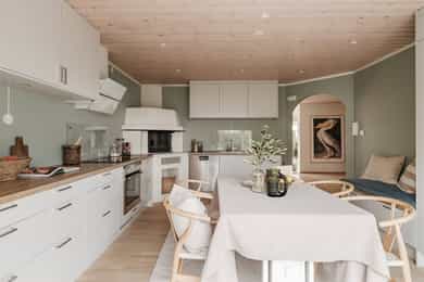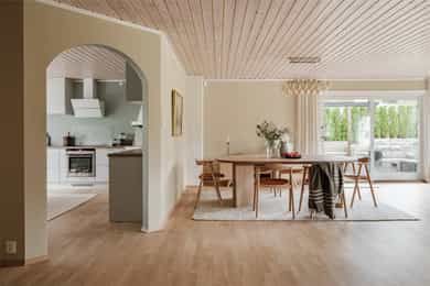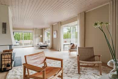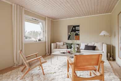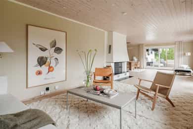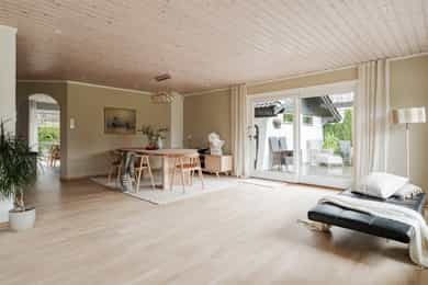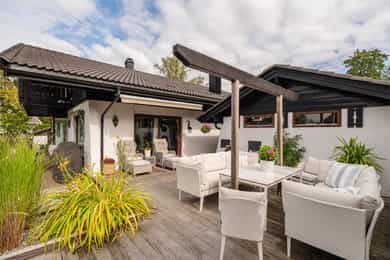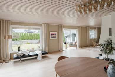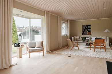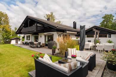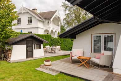 Stor og sjarmerende enebolig med hybel. Meget flotte solforhold. Attraktivt villaområde nær sjøen. Dobbelgarasje.