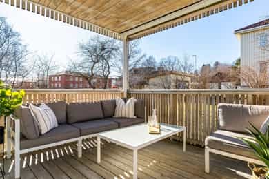 Strøken 4-roms på 121m² med to bad + vaskerom. Stor, sørvendt terrasse med adkomst til hage. Solrikt. Parkering m/ lader