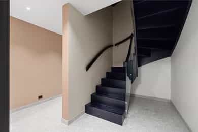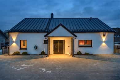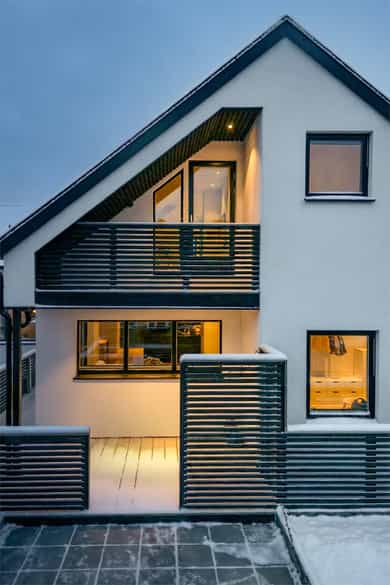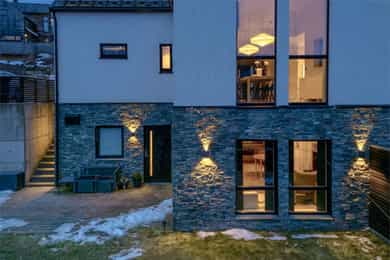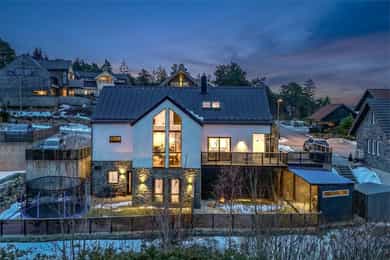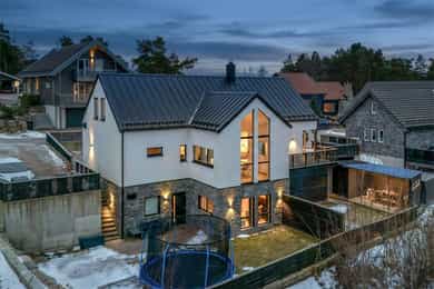 Eneboligen fra 2018 hviler flott i terrenget med en åpen underetasje i et skrånende terreng. Tomten er grundig opparbeidet med støttemurer som er forblendet med skifer. Gårdsplassen oppe er pent steinsatt. Hvitpusset mur mot brunsort detaljering og spilegelender gir boligen et tidløst, elegant uttrykk. Den strekker seg over tre etasjer, med en 3-roms utleieleilighet i underetasjen - utstyrt med egen inngang og skjermet hage. Hovedboligen har sin egen hageflekk ved siden av med en staselig oppmurt utestue. Alt her virker gjennomtenkt og påkostet, uten synlige snarveier.